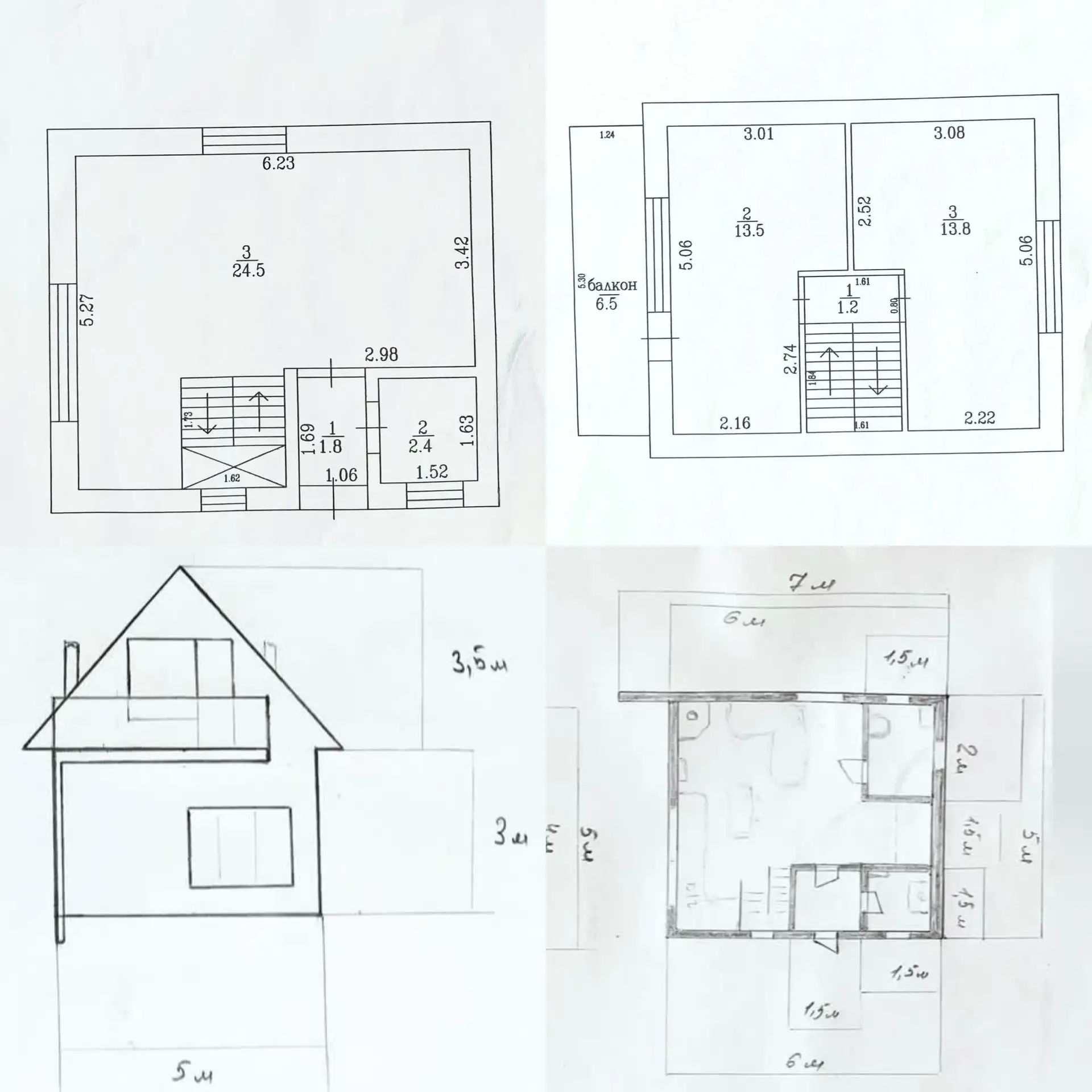 Изначально мы планировали построить обычный небольшой дачный домик, чтобы было где переночевать и отдохнуть. Ни у кого из нас не было опыта в проектировании и мы не знали всех тонкостей чертежей, за основу взяли простой масштаб: 1 м = 1 см. Рисовали много схем, долго думали, как всё расположить, чтобы было максимально удобно. Финальный чертёж с размерами есть на фото.