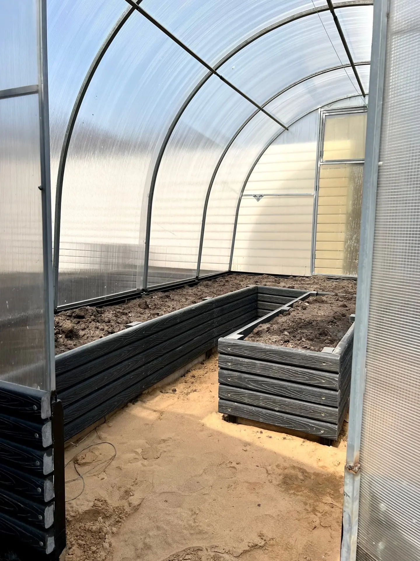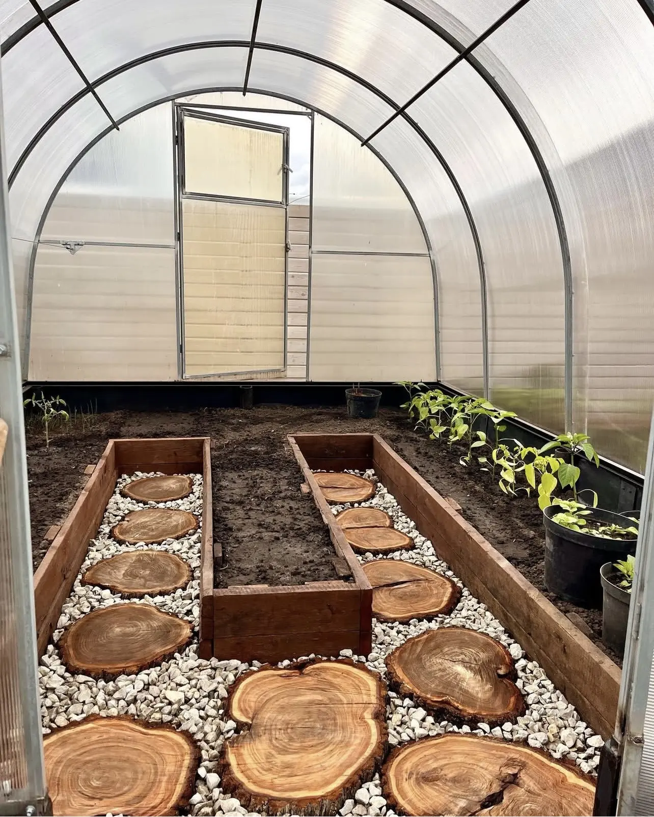 Те, кто с нами давно, помнят наш микро-огородик в самом начале пути. Потом Саша решил сделать мне временную, но полноценную теплицу с грядками и красивыми дорожками из спилов дерева.