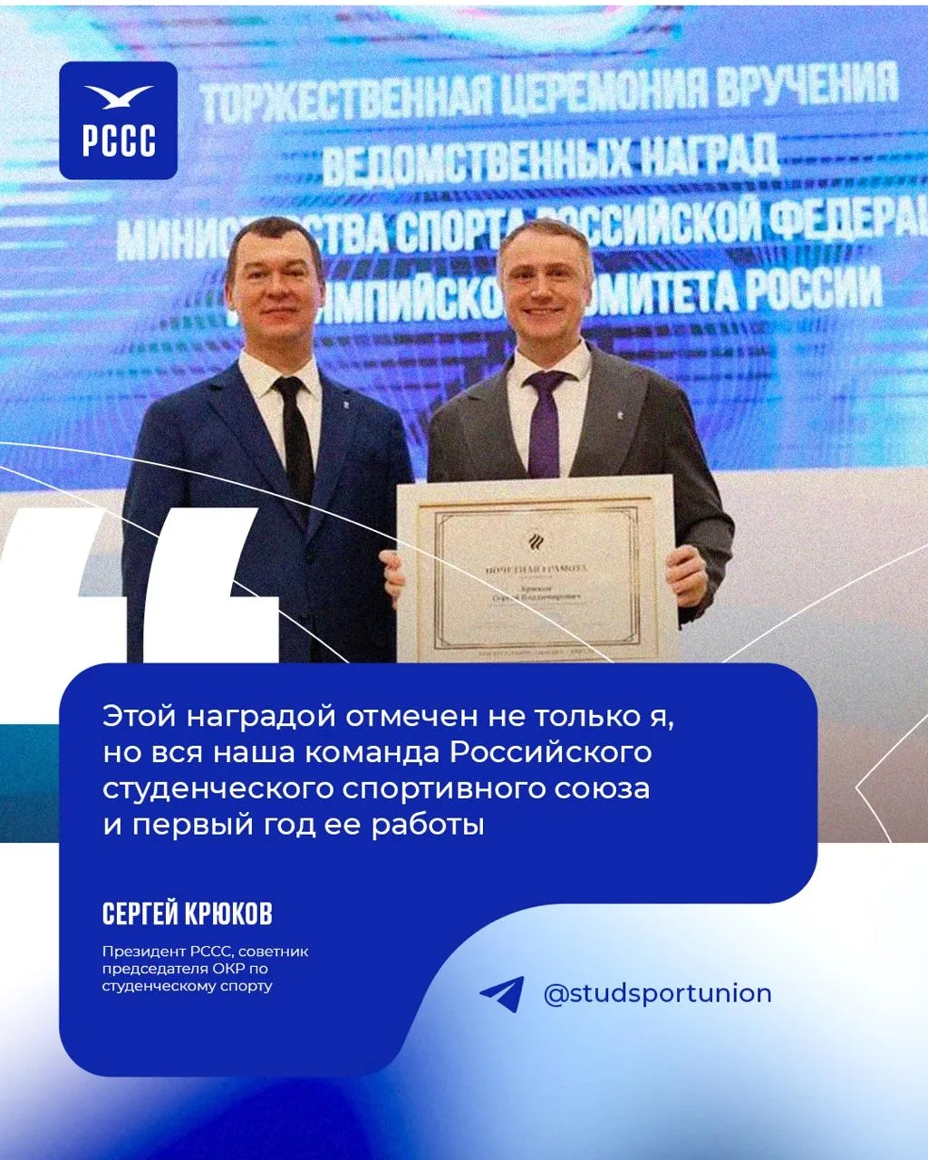 «Этой наградой отмечен не только я, но вся наша команда Российского студенческого спортивного союза и первый год ее работы. Для нас это большая гордость. Очень значимо и важно видеть, как уже сейчас реализовываются планы по дальнейшему развитию студенческого спорта в стране. И конечно, ничего этого не получилось бы без поддержки РССС со стороны Министерства спорта Российской Федерации и Олимпийского комитета России. Хочу – поблагодарить Минспорта России, ОКР и лично Михаила Владимировича Дегтярева за мощную поддержку, доверие и внимание к интересам и проблемам студенческого спорта. Впереди у нас много работы, большое количество амбициозных планов, ярких проектов и новых рекордов. <БУРЕВЕСТНИК> только набирает высоту», — отметил президент РССС Сергей Крюков.