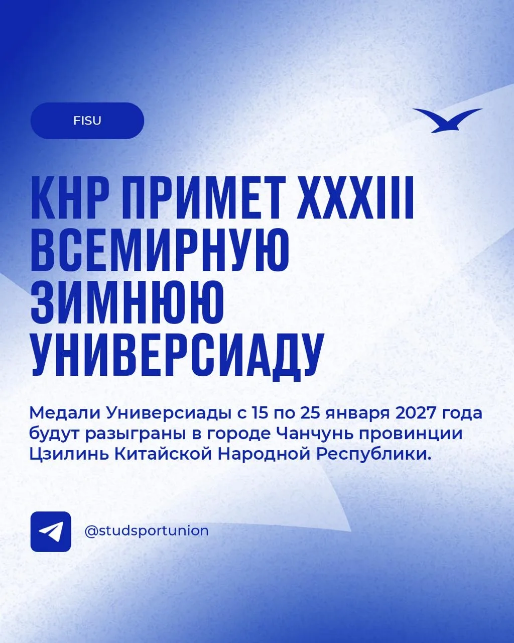⬆️Медали Универсиады с 15 по 25 января 2027 года будут разыграны в городе Чанчунь провинции Цзилинь Китайской Народной Республики.