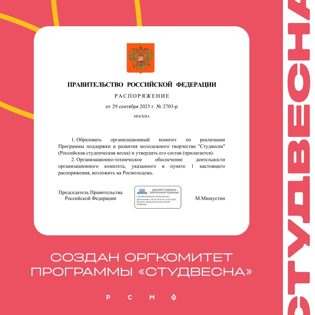 Распоряжением Правительства РФ образован организационный комитет по реализации Программы поддержки и развития молодежного творчества «Студвесна»(Российская студенческая весна).