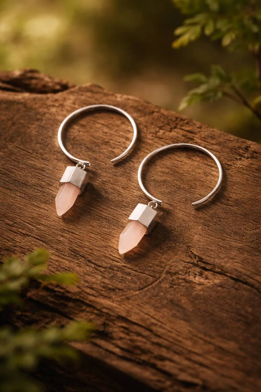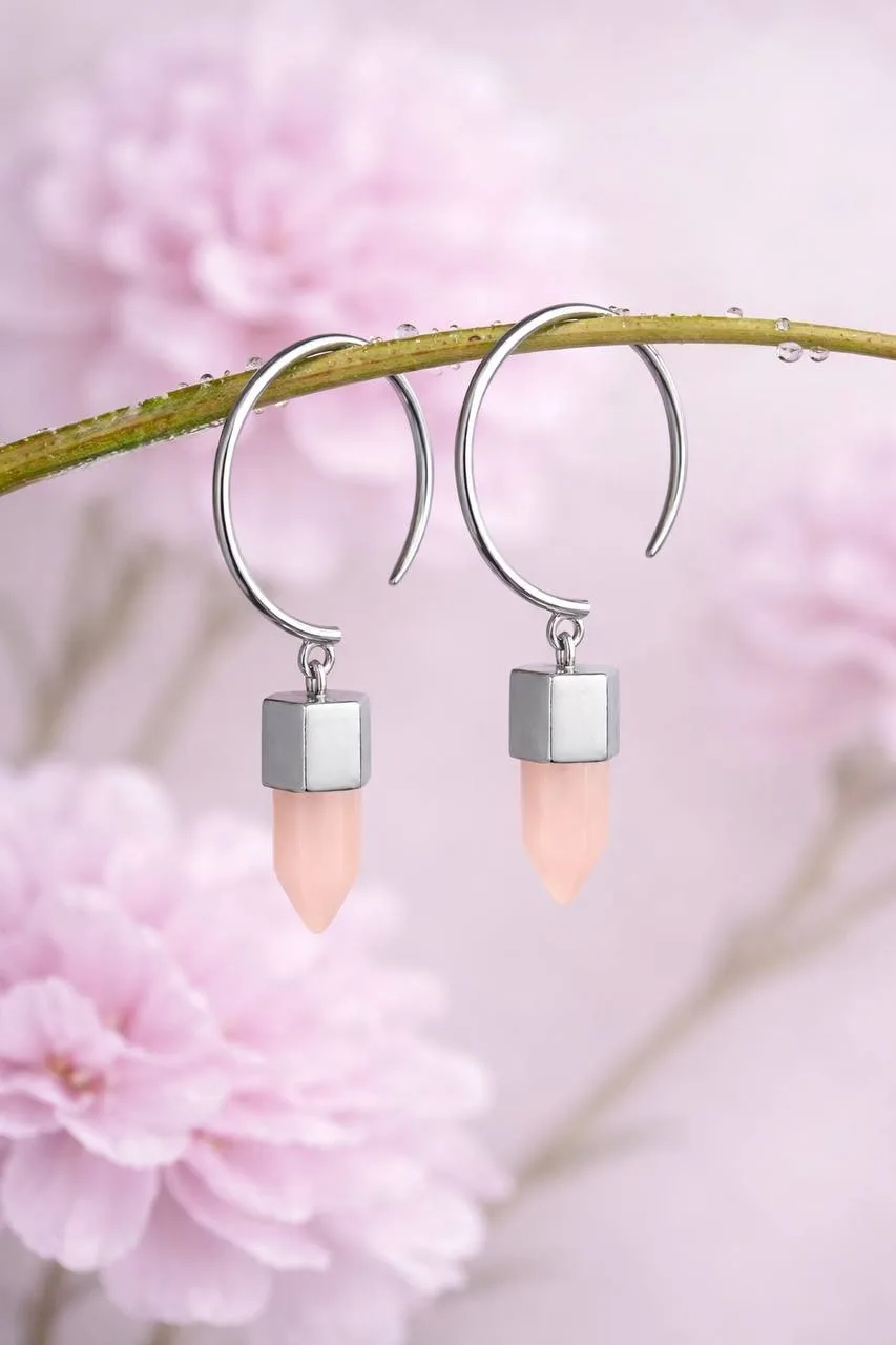 Лаконичные серьги кольца из серебра 925 держат форму, а натуральный розовый кварц мягко покачивается в движении.