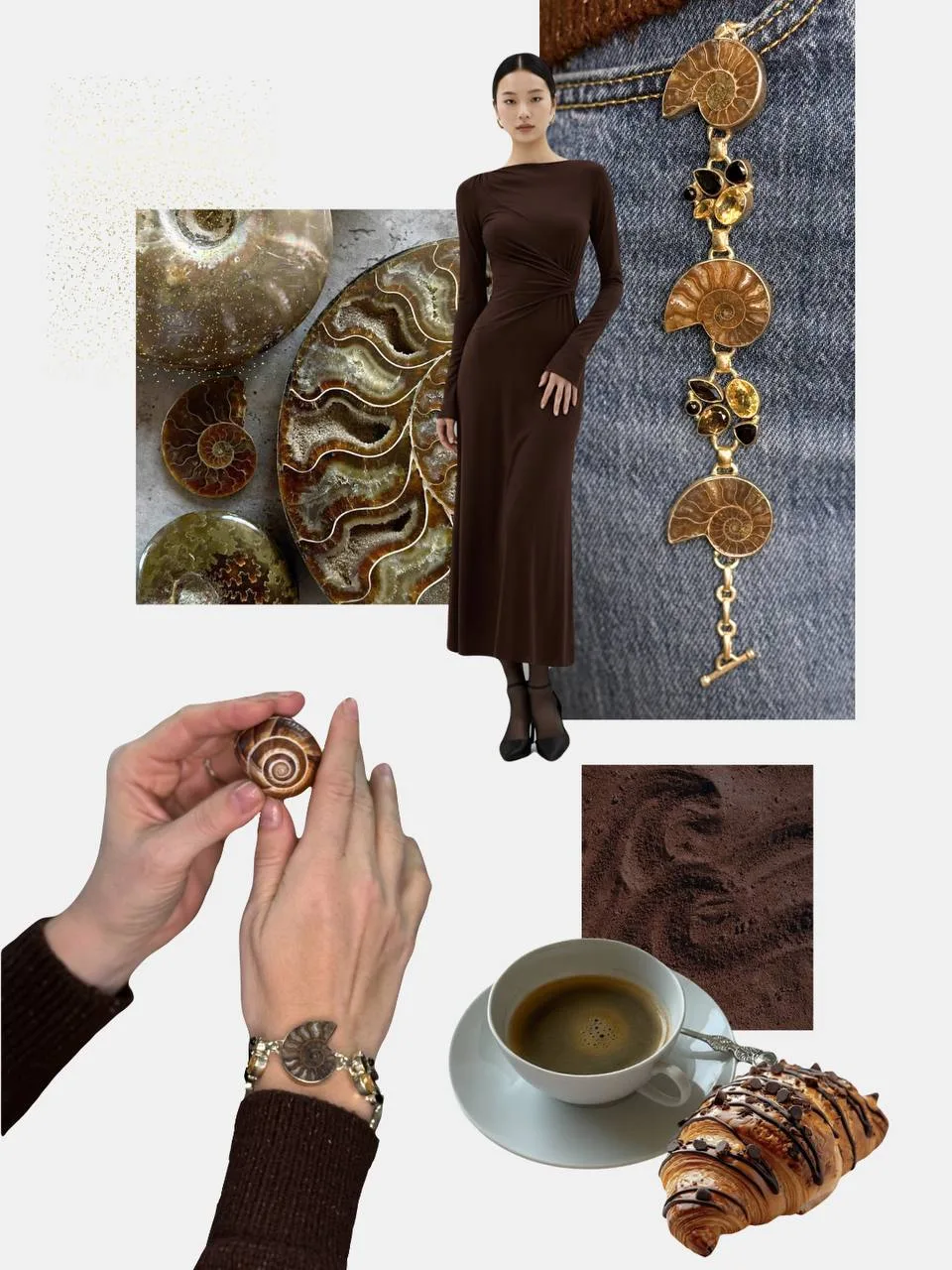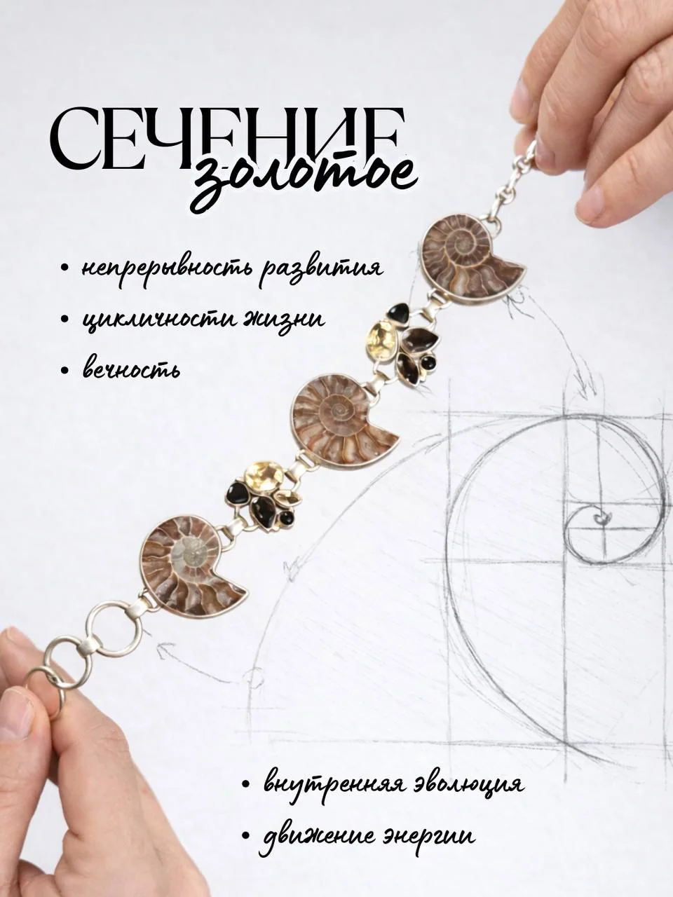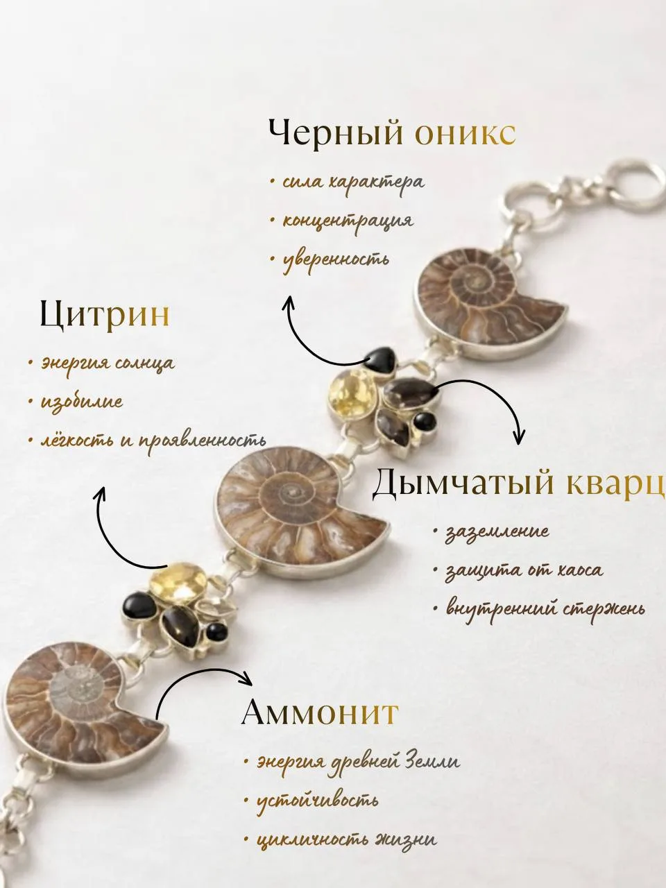 Браслет состоит из аммонитов, цитрина, дымчатого краина и чёрного оникса. Каждый из перечисленных камней и древней окаменелости излучает энергию и мощь, которую серебро усиливает и отлично дополняет.