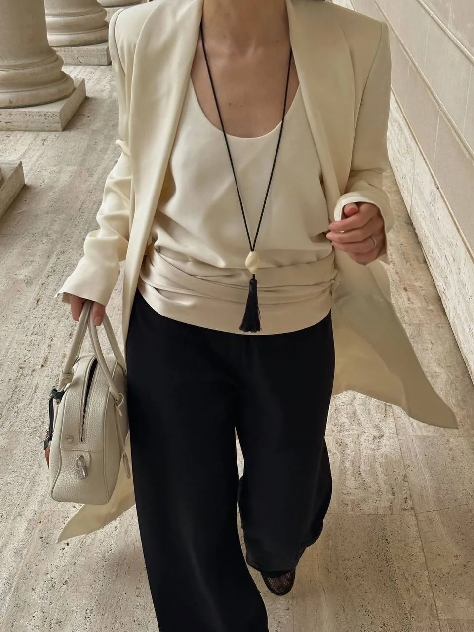 Базовый гардероб лучше всего работает в спокойных, «умных» оттенках: молочный, белый, бежевый, серый, темно-синий, графитовый, черный. Это те цвета, которые между собой почти всегда дружат. Вам нужно выбирать 1–2 основных нейтральных, и добавлять к ним светлую базу и один темный опорный цвет. На этом уже можно собрать рабочий гардероб.