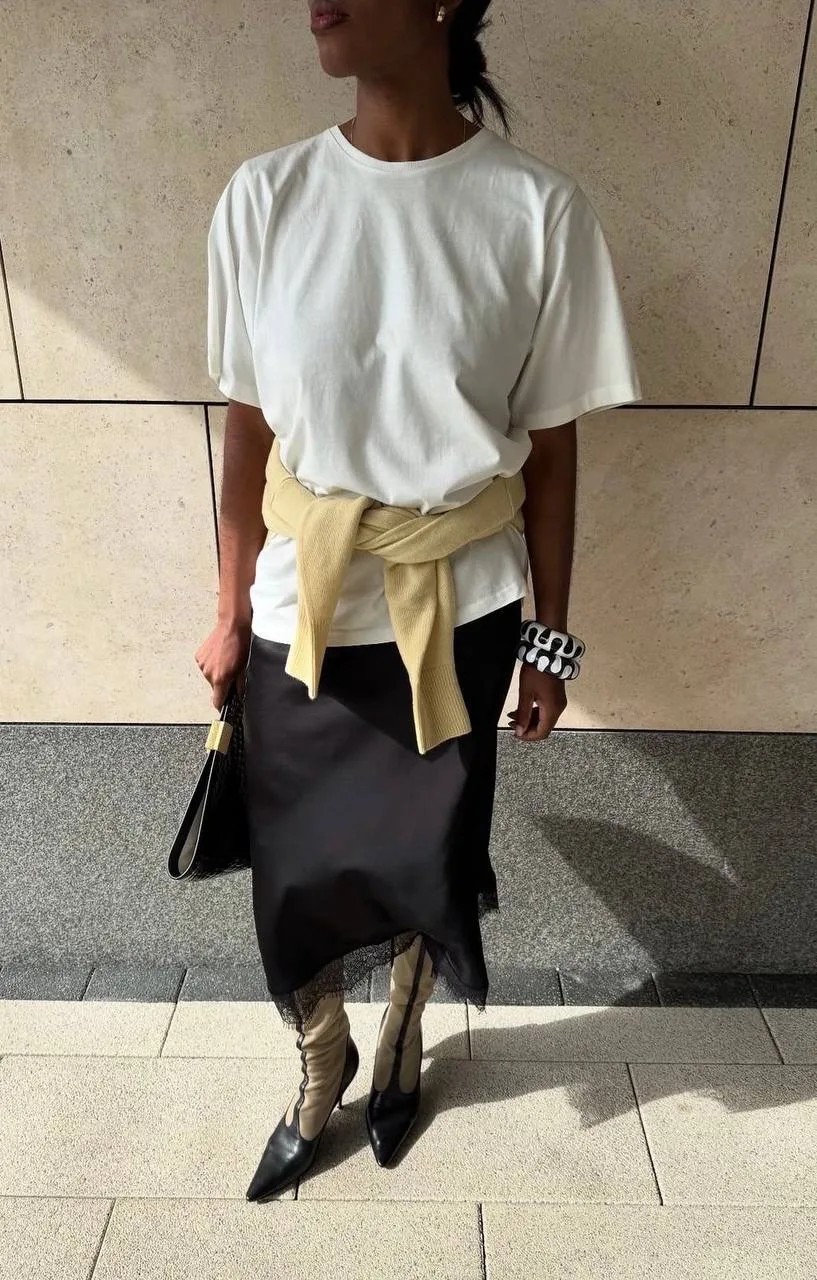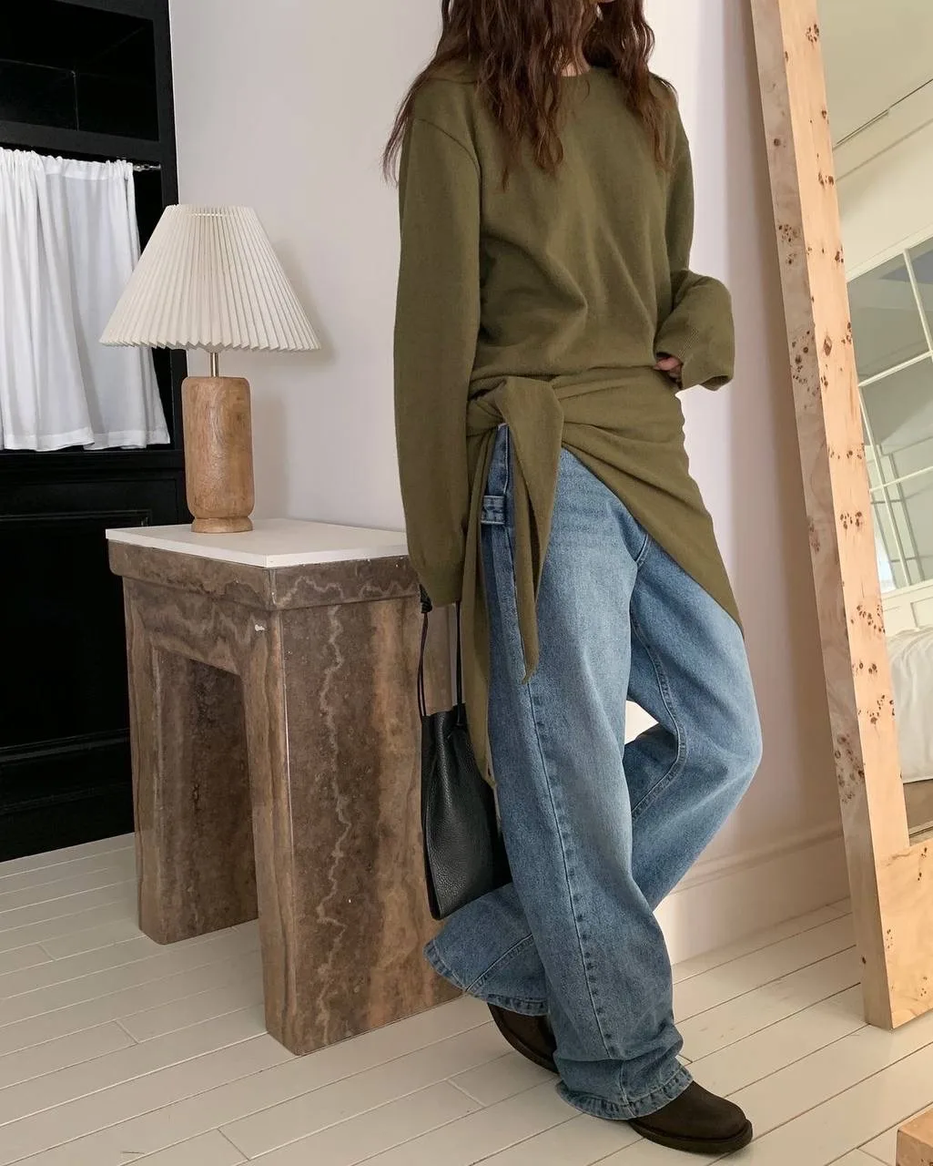 Если мне хочется сделать базовый образ визуально интереснее, то я просто повязываю поверх лонгслив или свитер.