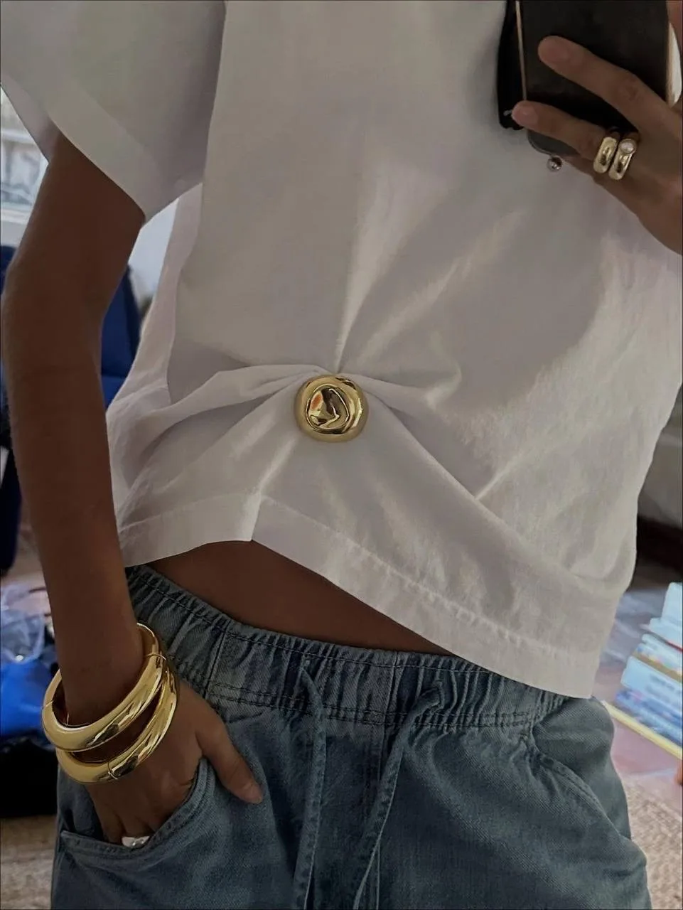 Как минимум, можно добавить интересную деталь — булавку с бусинами, которая заменит традиционную брошь. Буквально одно движение и футболка уже выглядит не просто базой, а вещью с изюминкой. Такой маленький акцент сразу собирает весь образ воедино⬆️