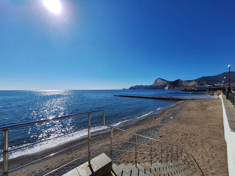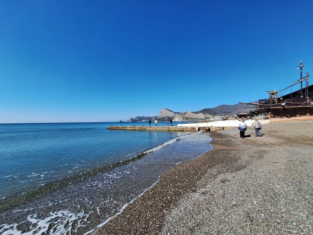 Сегодня выдался замечательный день: небо ясное, температура +12°, ярко светит солнце. Весна полностью вступила в свои права в Крыму. Прогулка у морского берега, свежий воздух и умиротворяющий шум волн. Вода в море прозрачная, солнечные лучи играют на её поверхности. Скоро наступит тепло, и можно будет наслаждаться купанием.