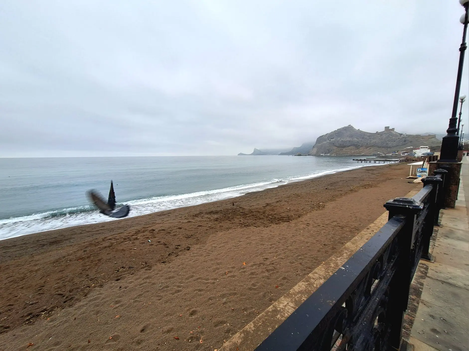 Сегодня в Крыму царит пасмурная погода, всё небо затянуто облаками. Однако в этой серости есть своя особая прелесть. Море успокоилось, и, хотя немного туманно, так приятно прогуляться и подышать свежим воздухом. Температура воздуха +15°C — это очень комфортно, и можно гулять почти в футболке.