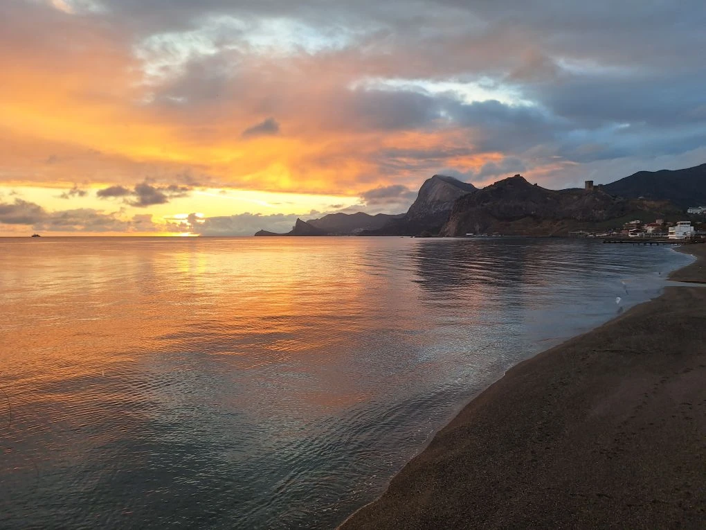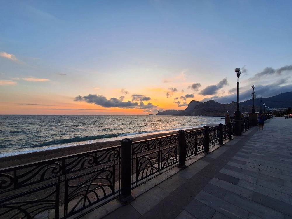 Сегодня в Судаке царит тёплый вечер: температура воздуха составляет +17°C, почти безветренно. Море спокойно, а небо окрашено закатными красками: оранжевым, розовым и фиолетовым. Как же красиво!