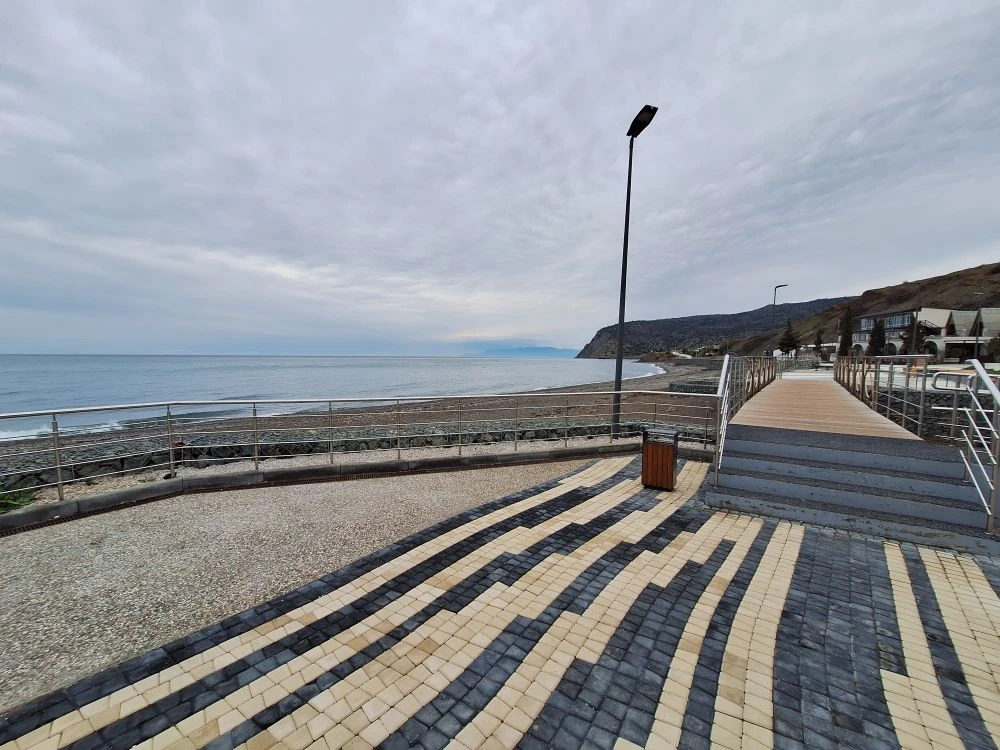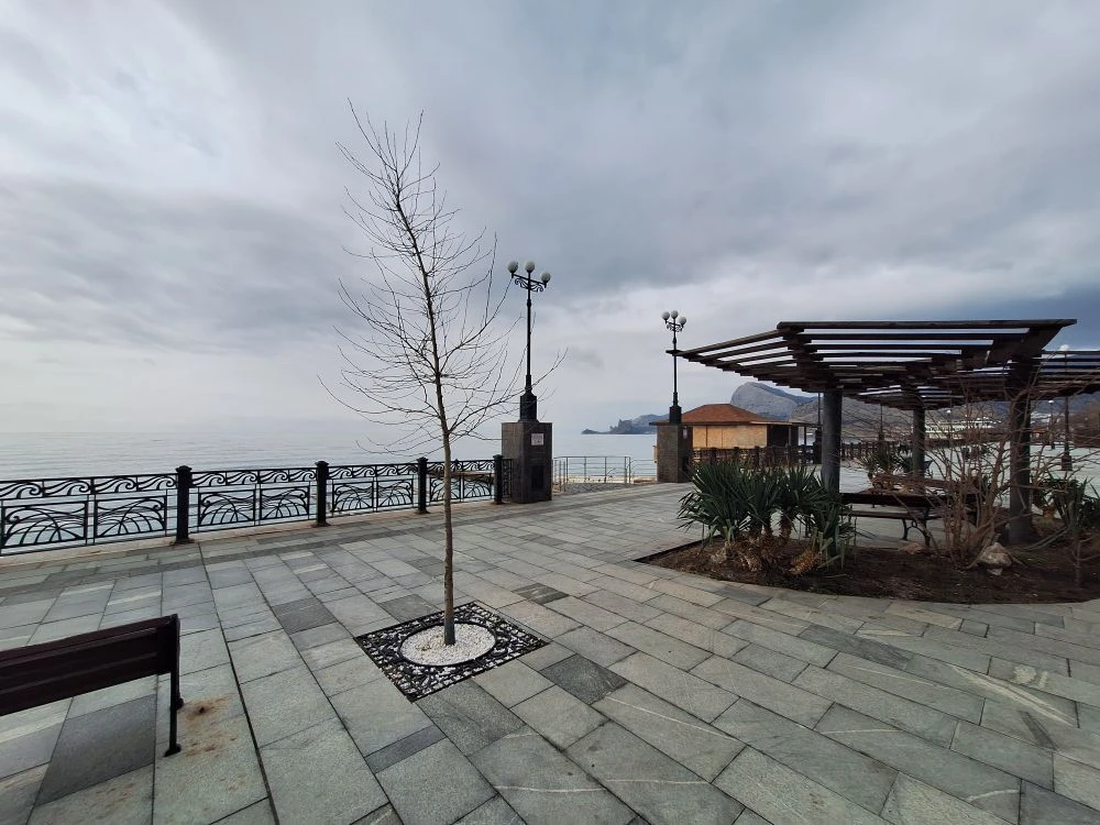 По прогнозам метеорологов, к Новому году в Крыму ожидается похолодание. Сегодня небо затянуто облаками, и температура воздуха составляет всего +7°C. Ветер и дождь отсутствуют, но небо уже не голубое. В такой спокойной обстановке можно гулять, слушать шум волн и дышать свежим воздухом.