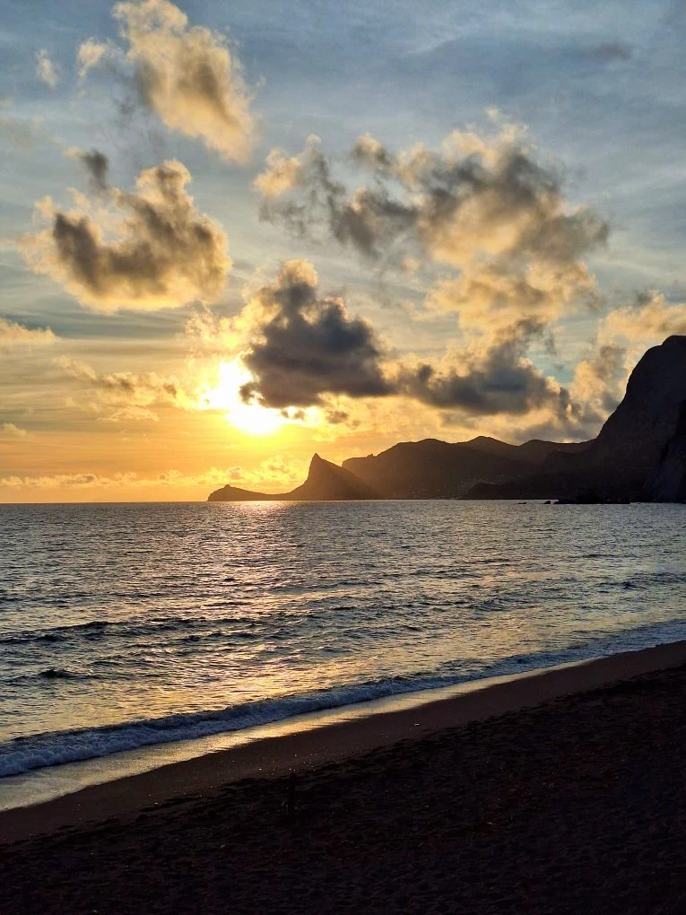 Днём шёл дождь, но к закату небо прояснилось — и вот уже виднеется яркое солнце, медленно уходящее за горизонт в море. Удивительная тишина и спокойствие, словно сама природа дарит момент для размышлений и наслаждения красотой. Зима здесь как-то особенно тепла и уютна, словно осень, которая не хочет прощаться!