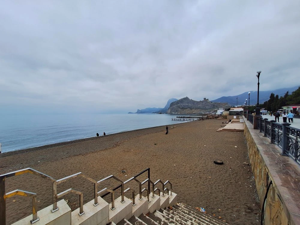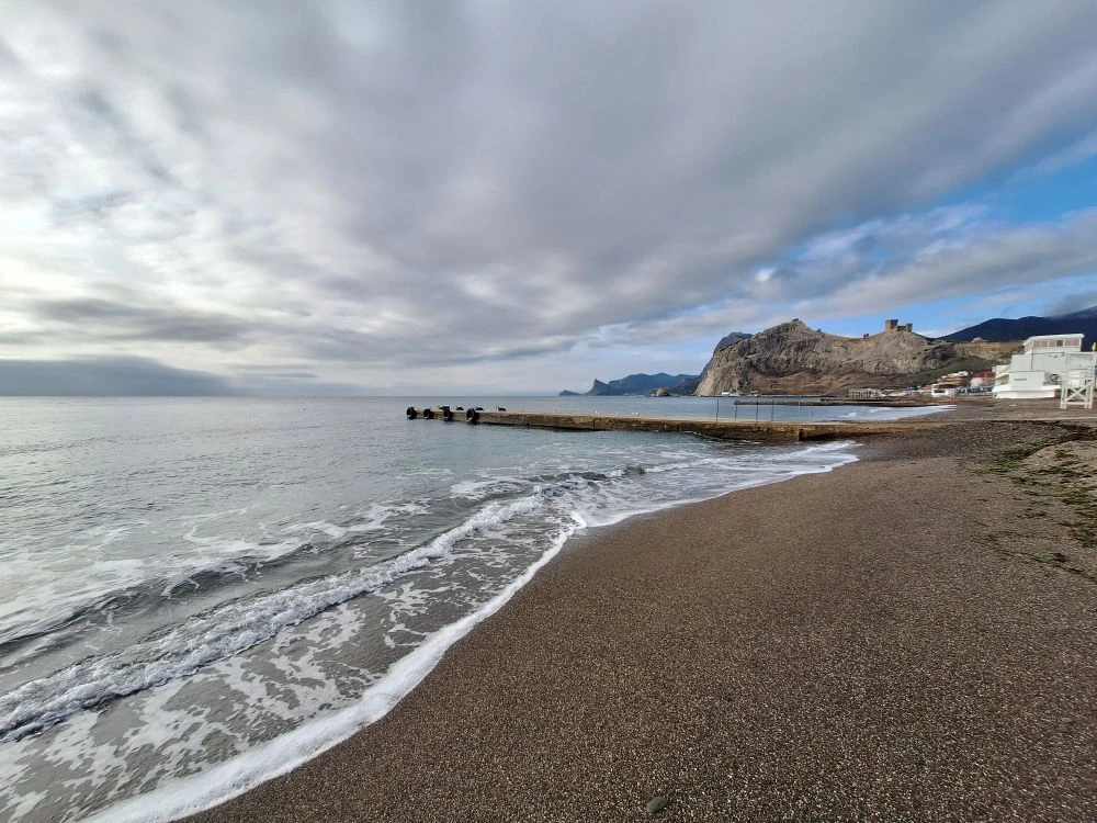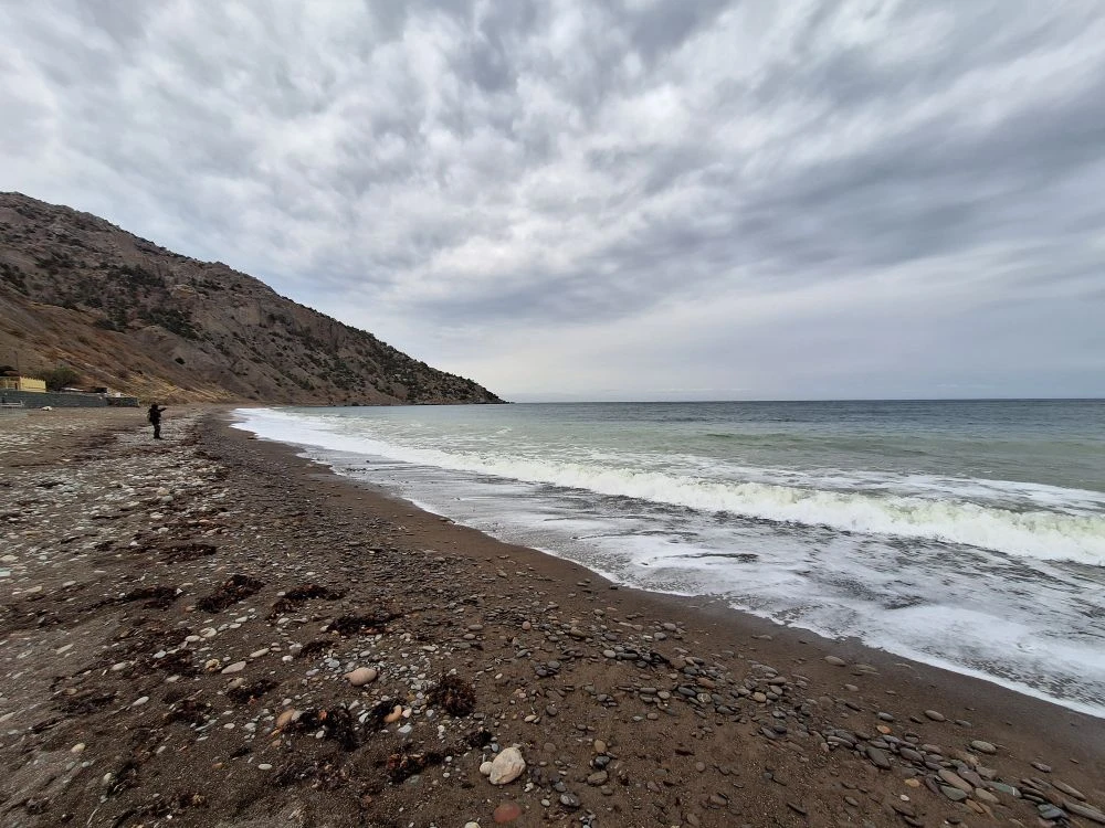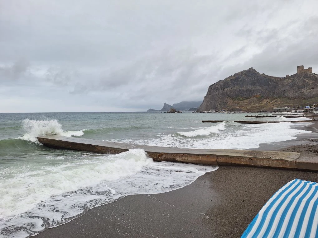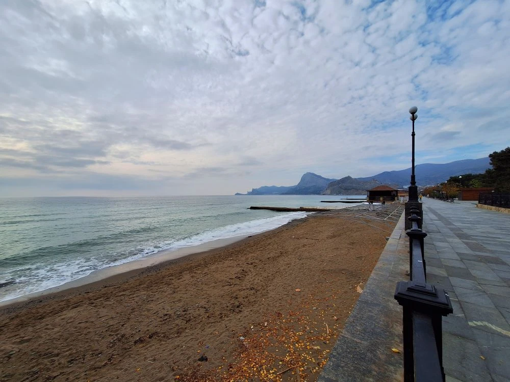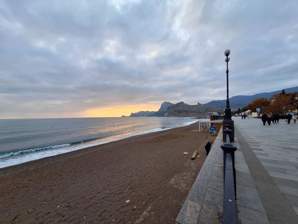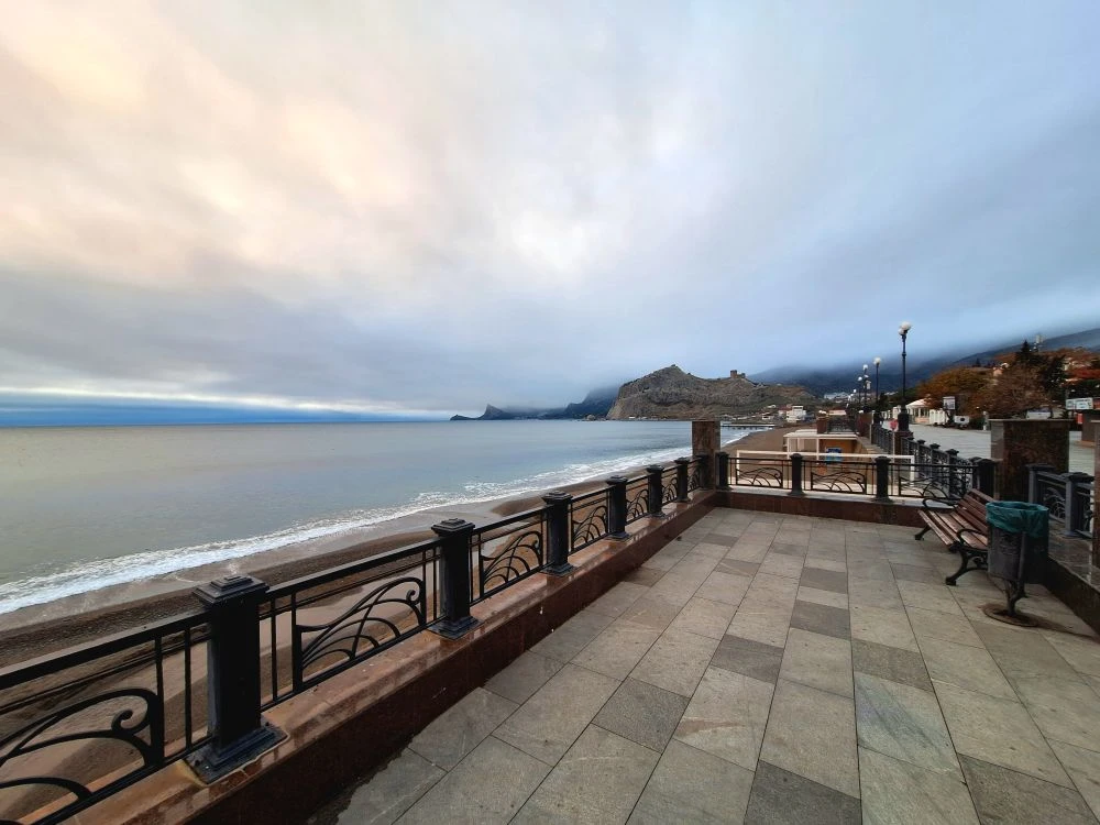 Сегодня в Крыму небо затянуто плотными облаками, и солнце скрылось за ними, не даря нам свои лучи. Но в то же время погода удивительно тихая: ни ветра, ни дождя, ни шторма. Отличное время для прогулки по побережью, чтобы насладиться морским воздухом. Это начало ноября в Судаке.