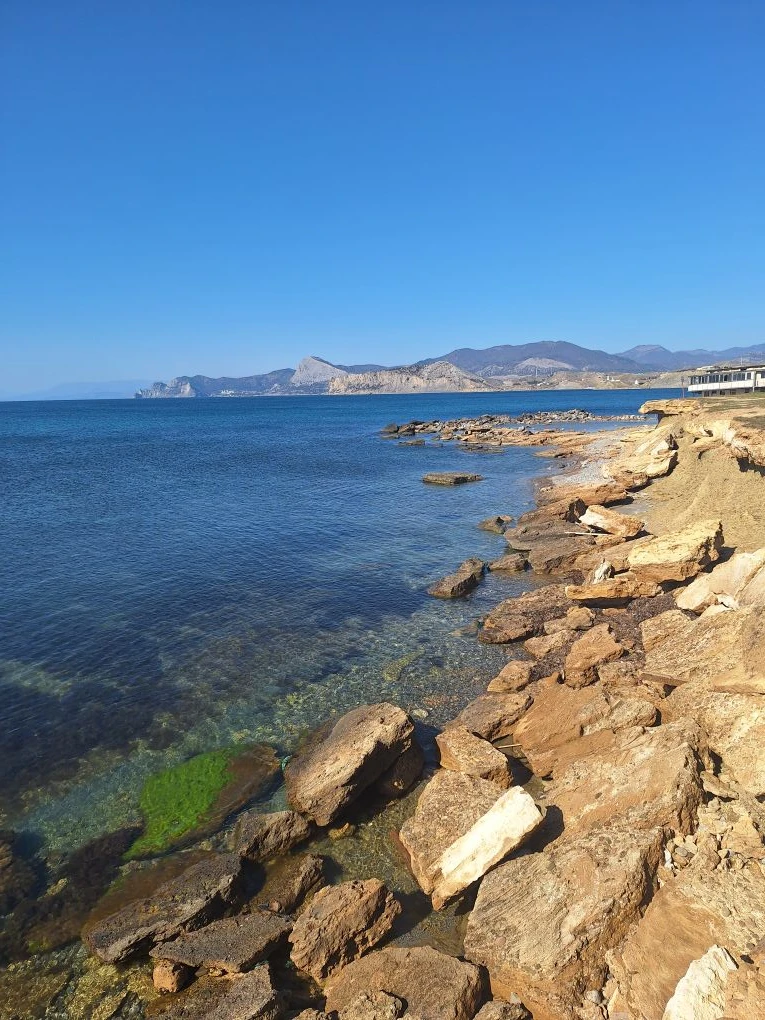 Сегодня в Крыму +10°C. Ярко светит солнце, небо ясное, море спокойное, вода прозрачная и чистая (около 10°C). Идеальные условия для прогулок вдоль побережья. Привет из Судака! 🌞🌊
