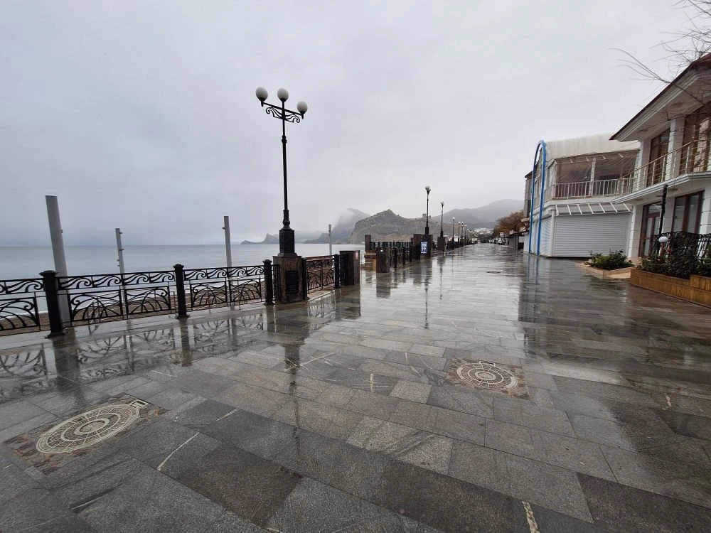 Сегодня в Крыму льет дождь: облака нависли над морем, а побережье покрыто серостью и влажным асфальтом. В Судаке тоже льет, ветра почти нет...