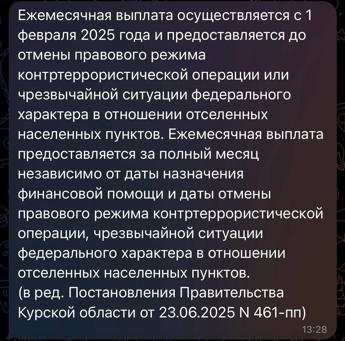 Выплата в ₽65 тыс., которая была введена в феврале после моего обращения к Президенту и продлена в мае. С начала года на эти цели уже выделено более ₽73 млрд. Правительством России принято решение осуществить выплату за декабрь, а после перераспределить средства на другие меры поддержки для восстановления и развития Курской области: нужно дать новый импульс экономике региона.