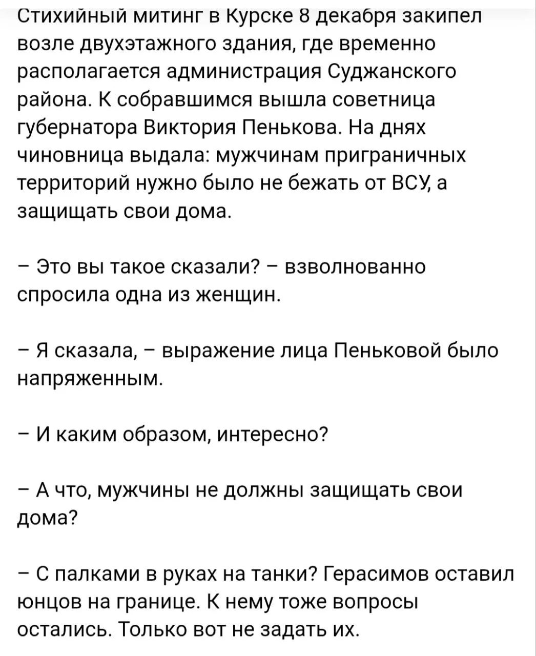 «В правительстве Курской области внимательно изучили обсуждаемые материалы. На данный момент, мы не видим подтверждений, что именно такая фраза была произнесена. Понимаем, что в информационном поле бывают недоразумения, особенно когда фрагменты вырываются из контекста или интерпретируются по-разному.