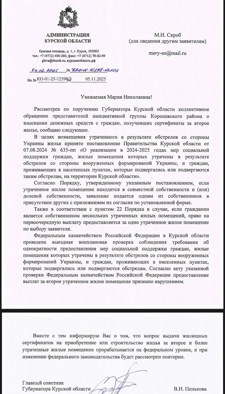 Женщина указала, что после пожара в 2014 году её домовладение в с. Казачья Локня было полностью восстановлено и являлось пригодным для постоянного проживания, в связи с чем, дом включен в список утраченных и, в соответствии с постановлением Правительства Курской области № 635-пп от 7 августа 2024 г., предусматривающим меры поддержки для граждан, чьи жилые помещения утрачены в результате обстрелов, ей предоставлен сертификат на приобретение нового жилья.