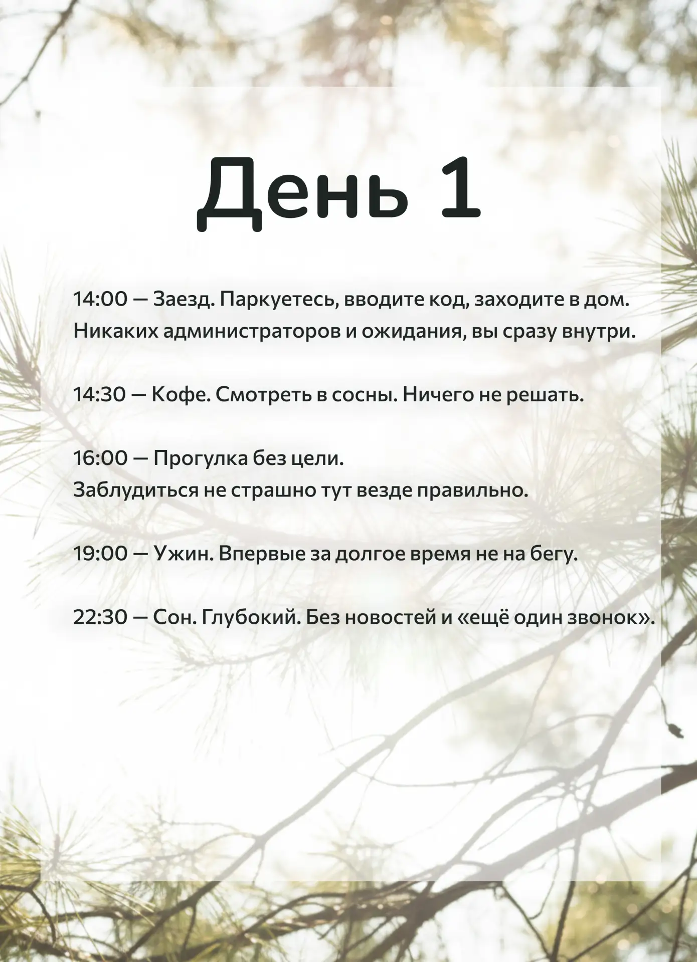 Здесь телефон быстро теряет власть. Сначала по привычке тянешься к экрану, а потом тишина, запах сосен и разговоры за столом забирают всё внимание.