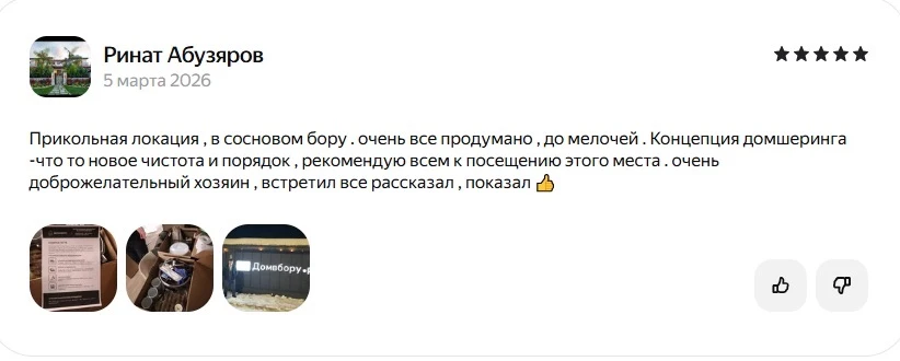 Рекомендую Домвбору всем, кто хочет отдохнуть от городской суеты и насладиться природой в комфортных условиях. Спасибо, что делаете всё с душой!»