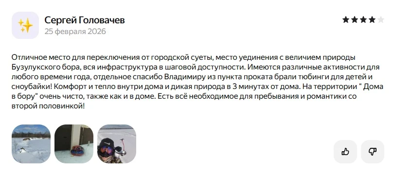 «Впервые остановилась в доме подобного формата, и этот опыт оставил исключительно приятные впечатления. Домвбору - это удивительное место, где чувствуешь полное единение с природой. Расположенный в самом сердце Бузулукского бора, дом предлагает комфорт и уют, сохраняя при этом атмосферу уединения и спокойствия.