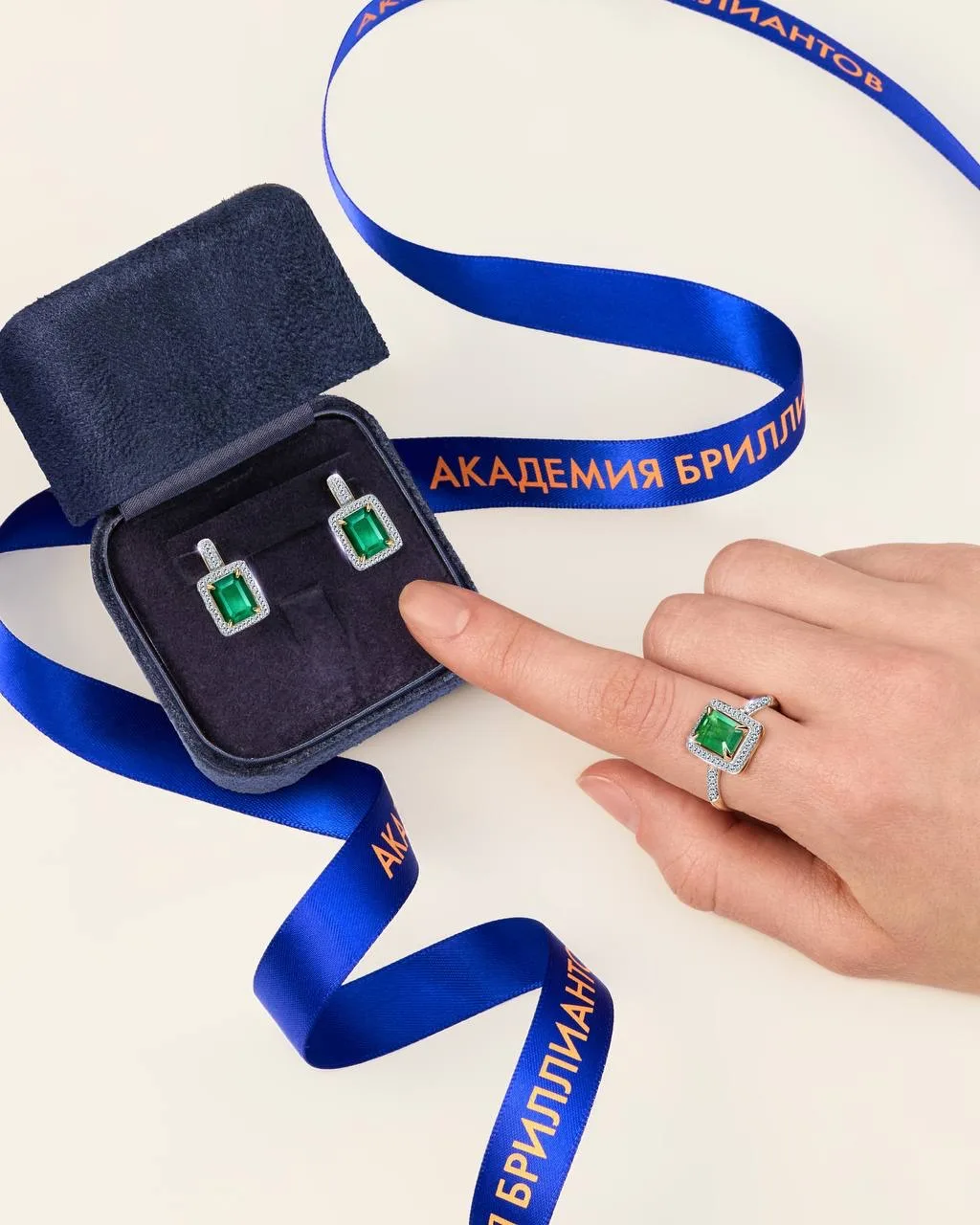 Кольцо с изумрудом 1.48 карата в огранке «изумруд» и серьги с двумя изумрудами 2.8 карата в огранке «изумруд» станут ярким акцентом для весенних и вечерних образов.