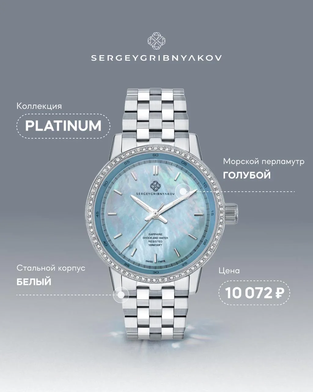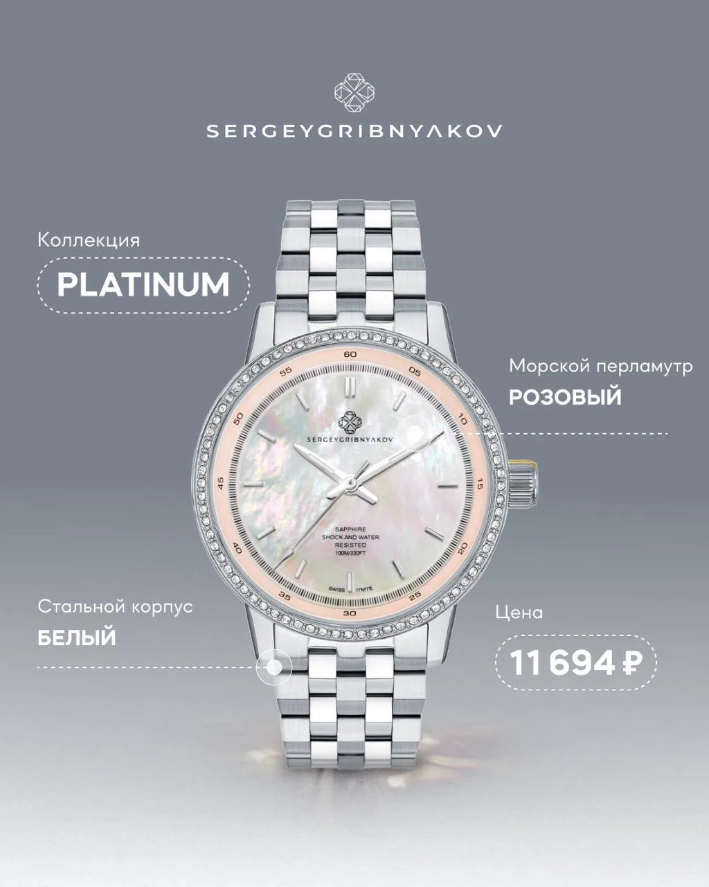 Например, стальные часы SERGEY GRIBNYAKOV из премиальной коллекции Platinum в трёх оттенках: жёлтое золото с белым циферблатом, розовое золото с черным циферблатом, белое золото с голубым и розовым циферблатом.