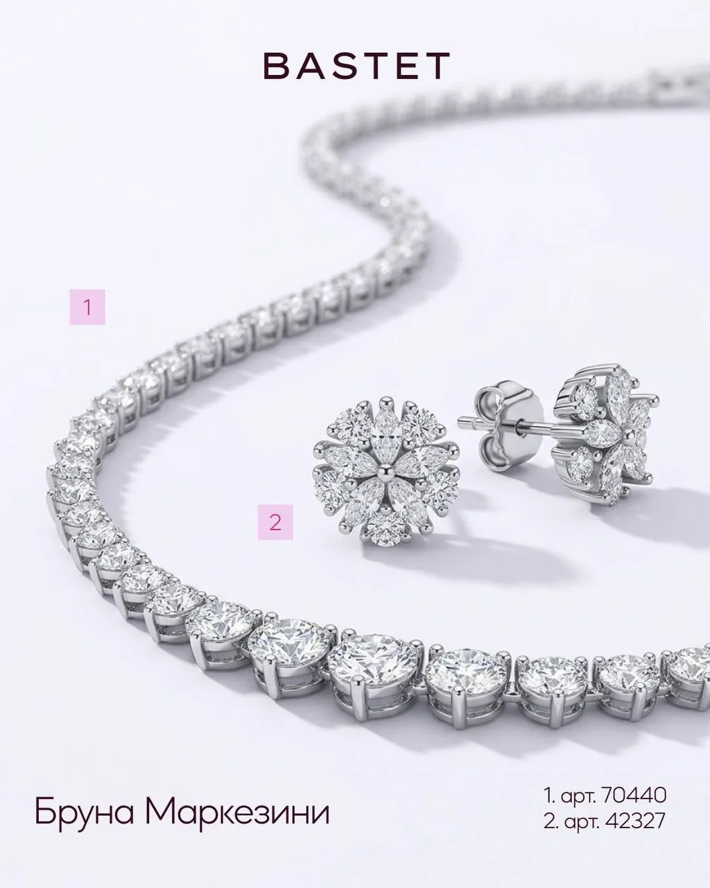 ❤️Бруна Маркезини сделала выбор в пользу элегантной классики: пусеты-цветки с фианитами и изящное колье с фианитами.