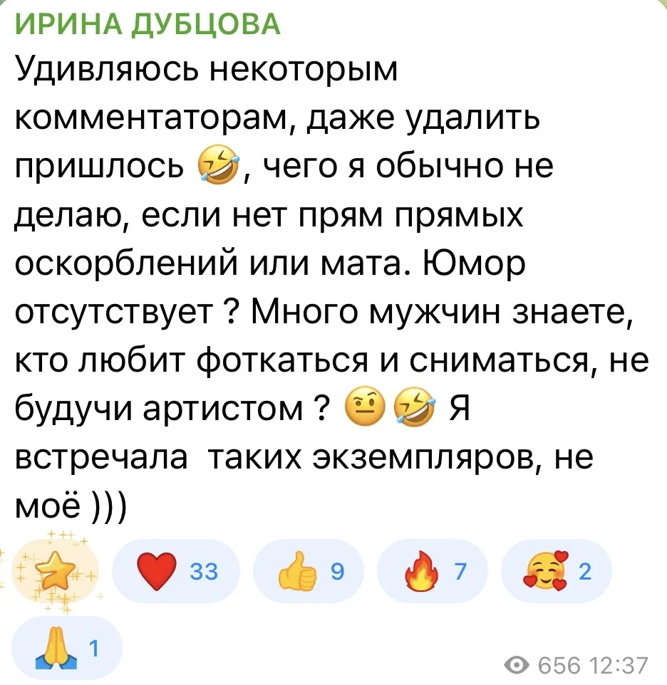 «Юмор отсутствует? Много мужчин знаете, кто любит фоткаться и сниматься, не будучи артистом? Я встречала таких экземпляров, не моё», — отметила Ирина.