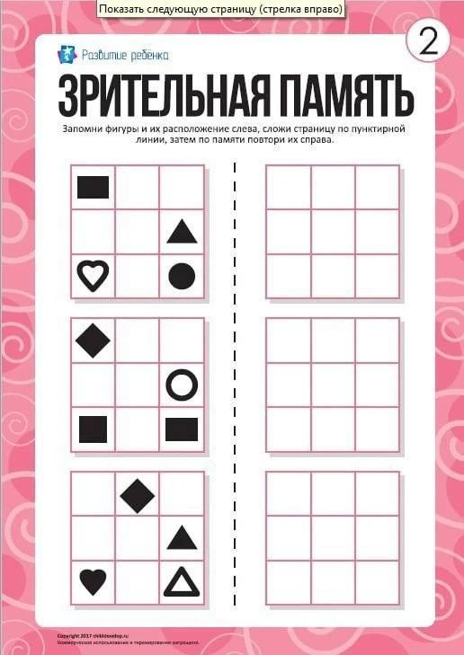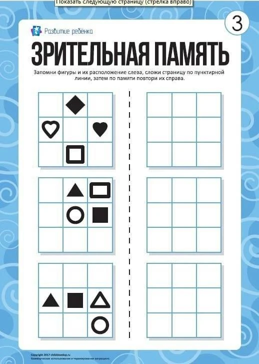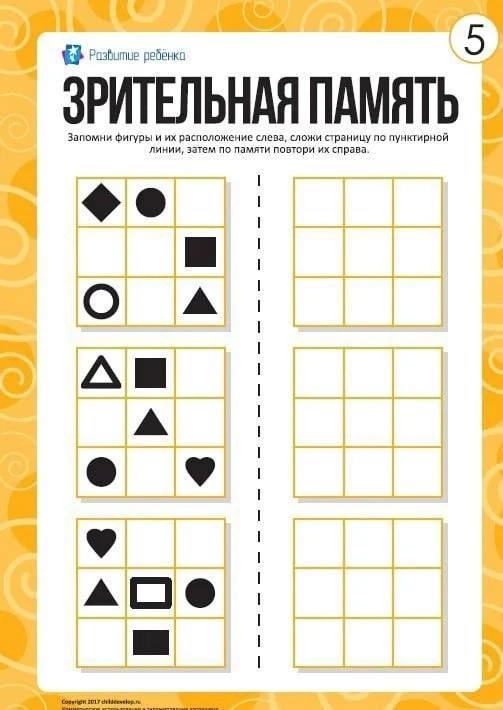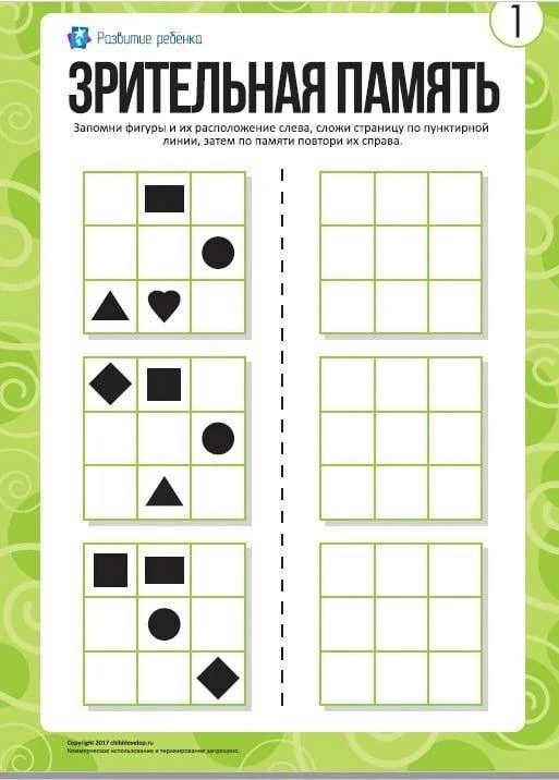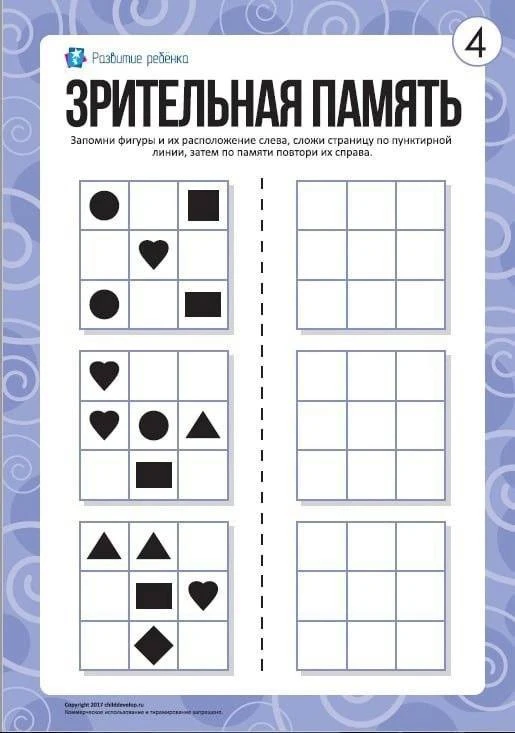Ребенку нужно запомнить фигуры и их расположение слева, сложить страницу по пунктирной линии, затем по памяти повторить их справа.