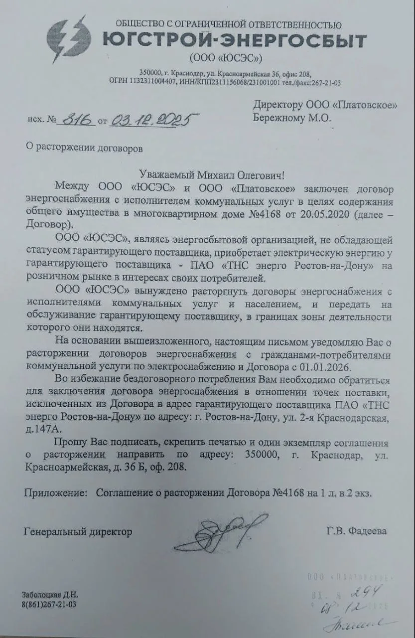 ООО „Югстрой-энергосбыт“ полностью уходит с Суворовского с 1 января 2026 года.