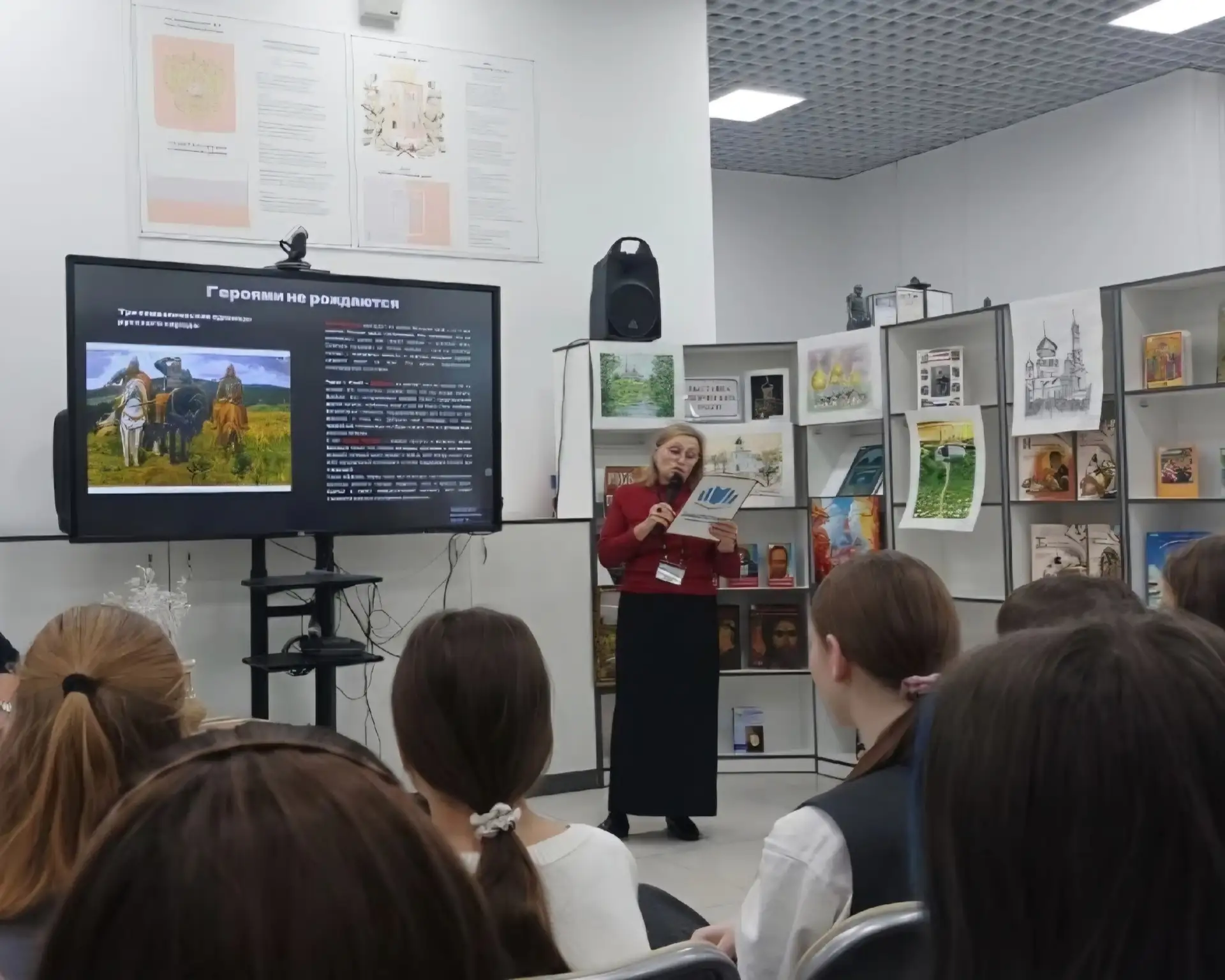 Библиотекарь Ершова Т.А. рассказала об истории праздника и героических подвигах защитников Родины, включая тему СВО.