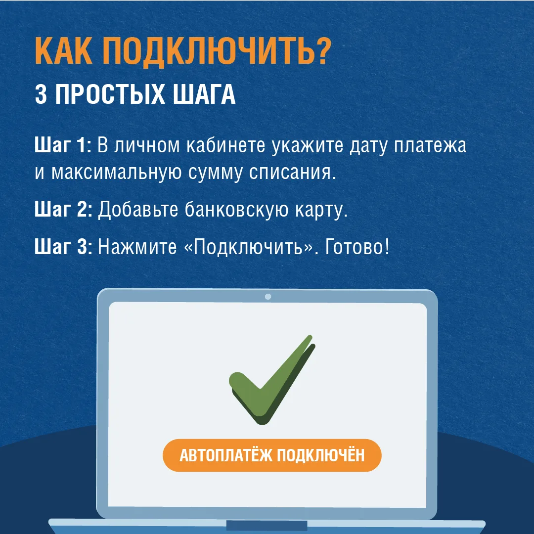 В потоке ежедневных дел иногда можно упустить дату очередного платежа. Но подключив автоплатёж, вы точно не забудете про оплату счетов.