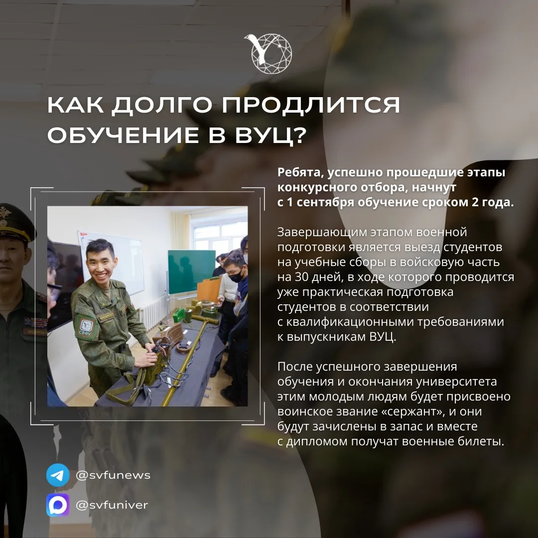 Продолжая славные традиции, заложенные еще в те годы, при федеральном университете с 2022 года функционирует Военный учебный центр СВФУ.