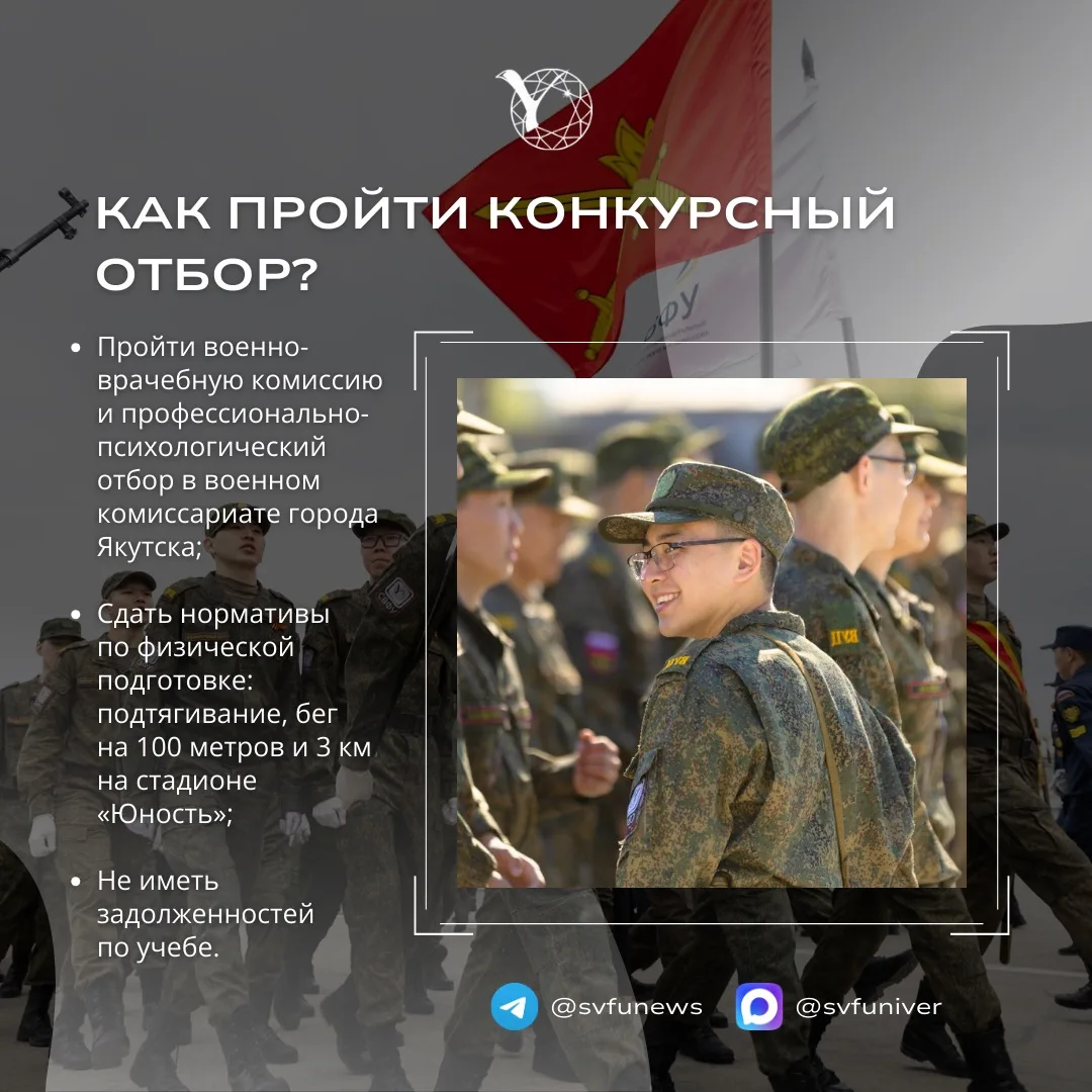 В Военном учебном центре СВФУ стартовал конкурсный отбор курсантов на 2026 год – обучение продлится два года, по его завершении пройдут учебные сборы в настоящей войсковой части. После окончания ВУЦ молодые люди получат военные билеты и будут зачислены в запас Российской армии.