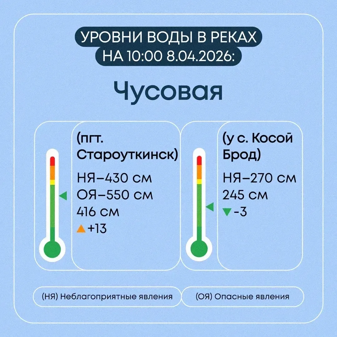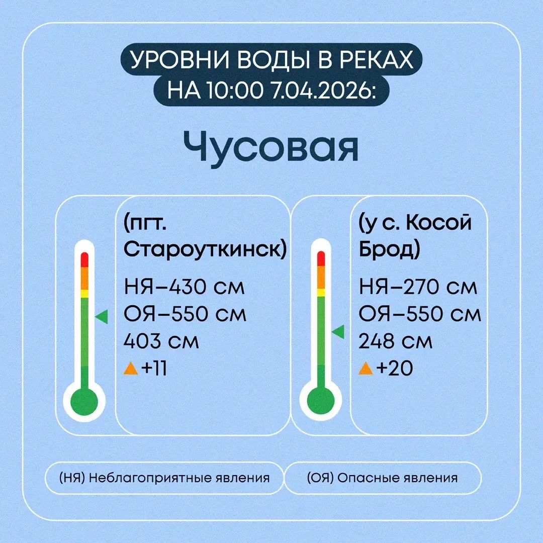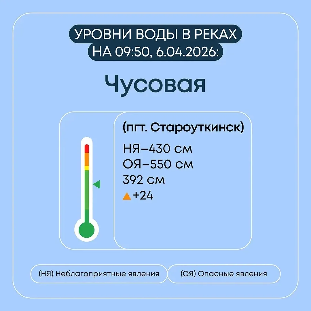 Уровень воды в р. Чусовая за сутки повысился на 11 см и составляет 403 см. В результате подъема уровня воды в р. Чусовая произошло подтопление 1-й придомовой территории. Эвакуация жителей не требуется.