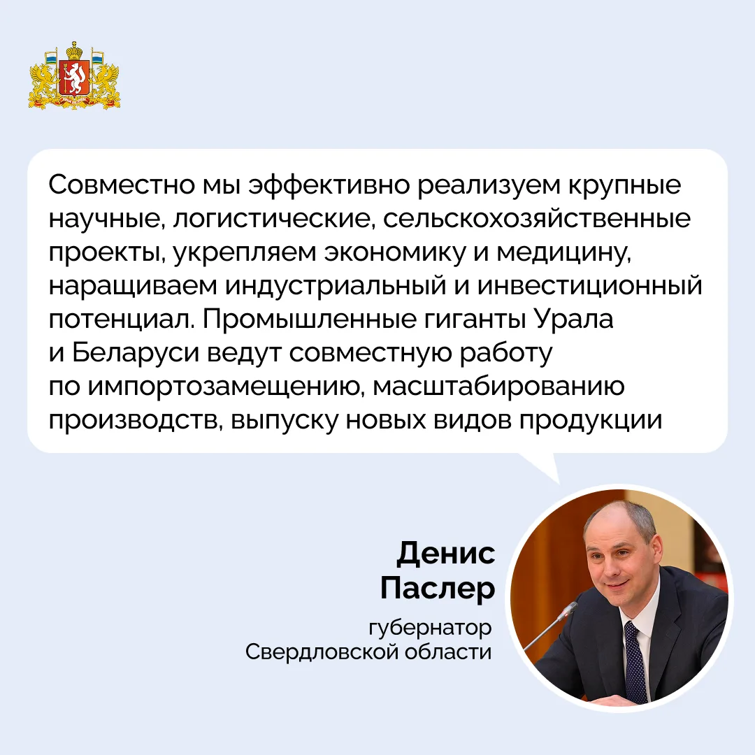 💬 «Уверен, что дальнейшие партнерские связи Свердловской области и Беларуси приведут к успешному воплощению всех задуманных планов. Желаю уральцам и белорусам счастья, благополучия и всего самого доброго!» – сказал Денис Паслер.