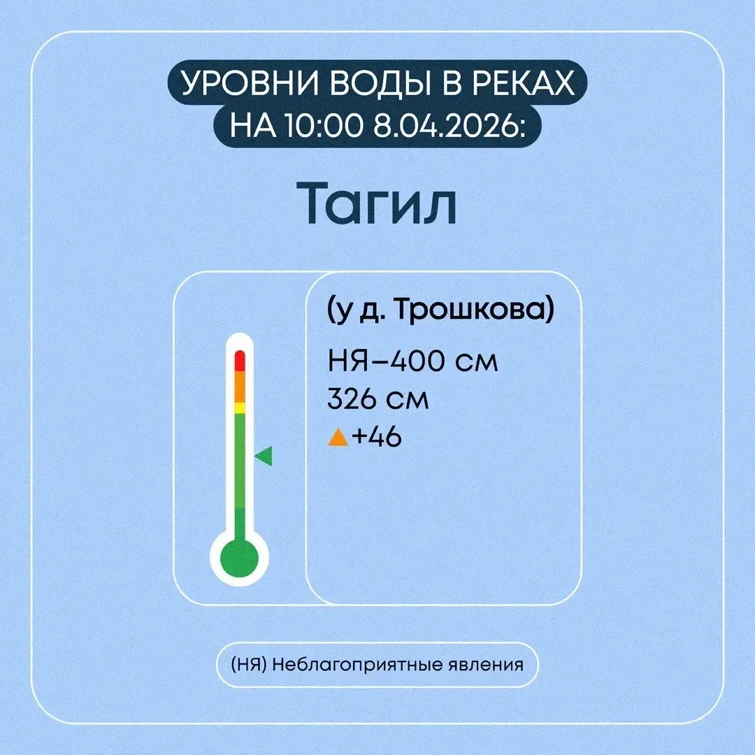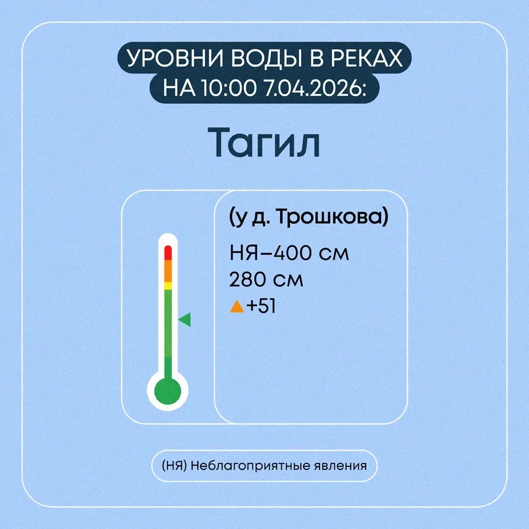 Уровень воды в р. Тагил за сутки повысился на 51 см и составляет 280 см (НЯ-400). Подтоплены 2 садовых участка в к/с «Автомобилист 2». Возможно увеличение зоны подтопления до 8-ми садовых участков.