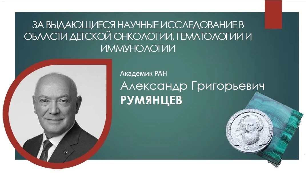 🔹 В номинации «Медицина» лауреатом стал академик РАН Александр Григорьевич Румянцев (Москва) — выдающийся ученый-педиатр, доктор медицинских наук, основатель и многолетний руководитель НМИЦ детской гематологии, онкологии и иммунологии им. Дмитрия Рогачева.