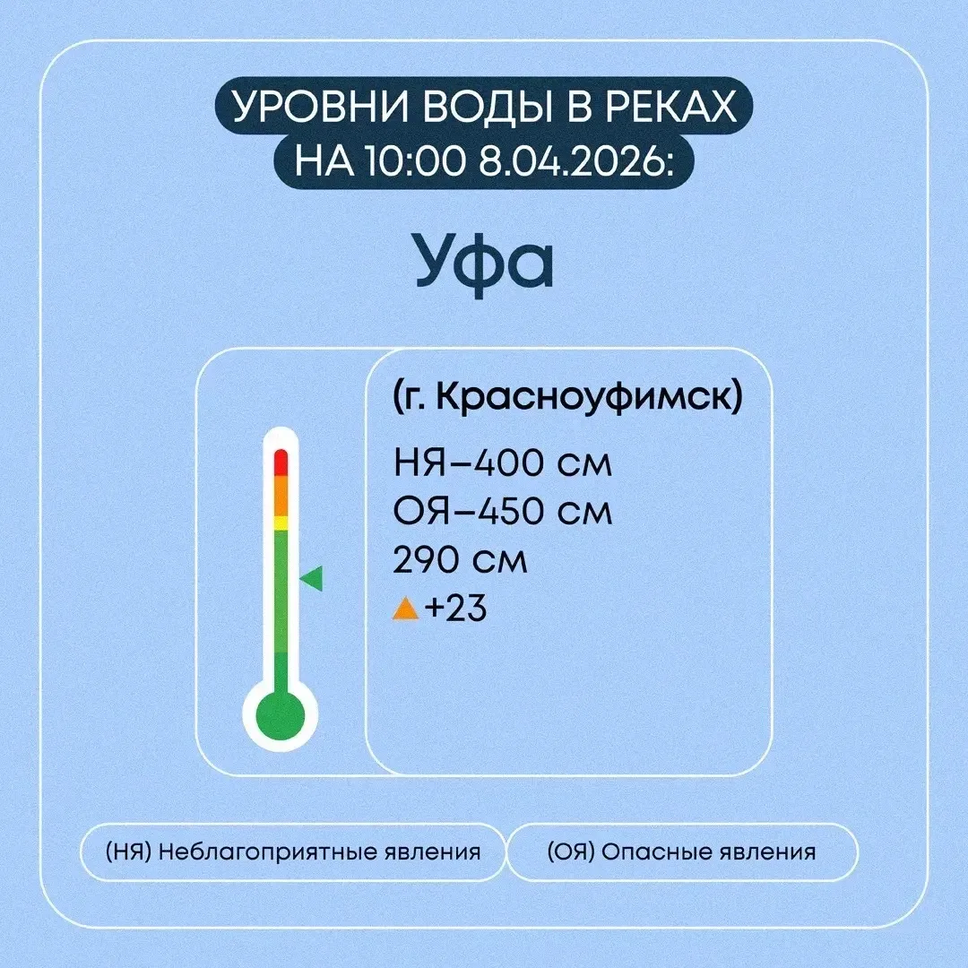 Уровень воды в р. Уфа за сутки повысился на 33 см и составляет 267 см (НЯ-400, ОЯ-450). В связи с подтоплением участка дороги по бывшему руслу р. Уфа временно ограничено автотранспортное и пешеходное сообщение с четырьмя частными домами по ул. Остров. Угрозы подтопления домов нет, эвакуация населения не требуется.