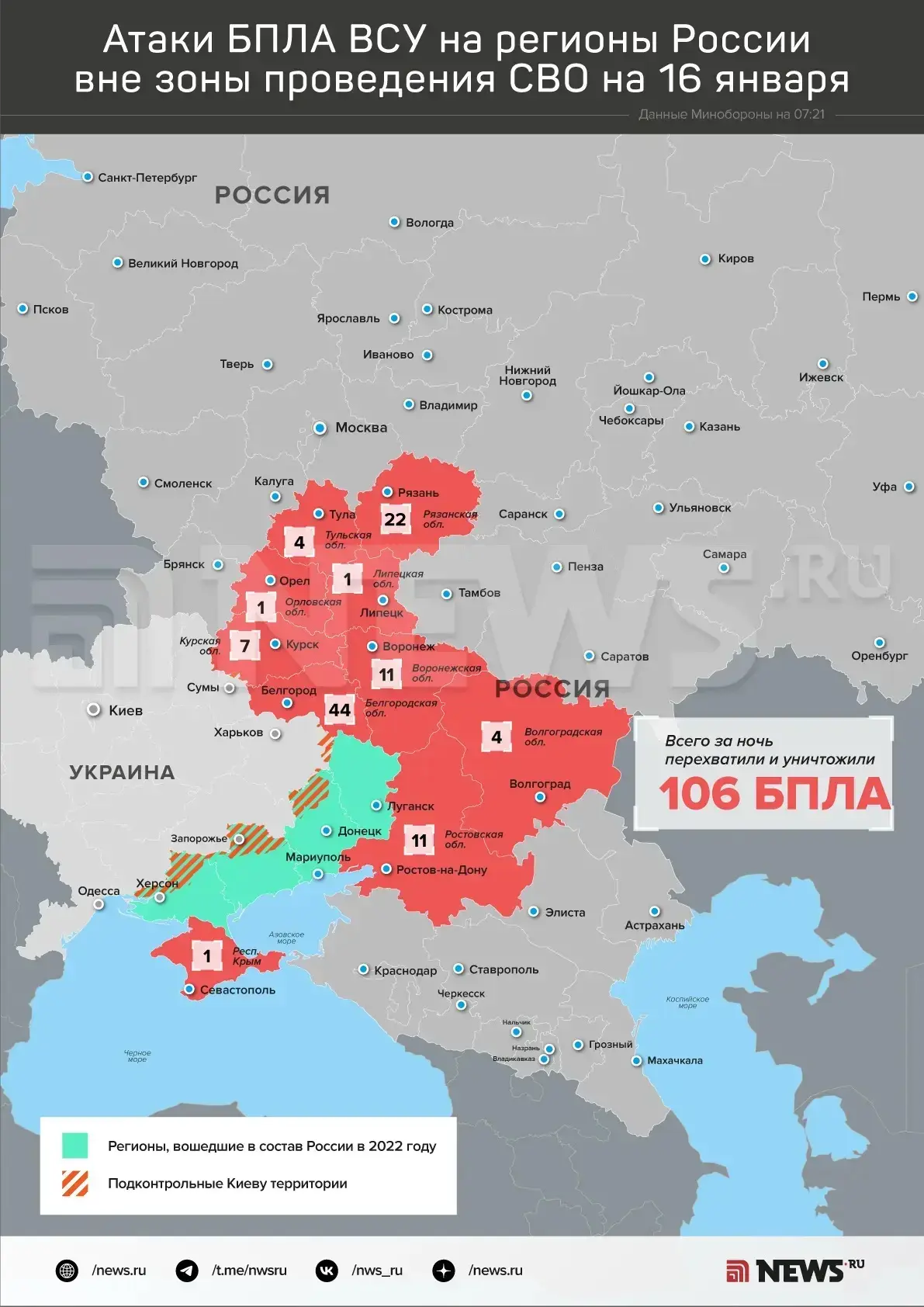 44 дрона уничтожили над Белгородской областью, 22 — над Рязанской, по 11 — над территориями Ростовской и Воронежской областей. Подробнее — в нашей инфографике.