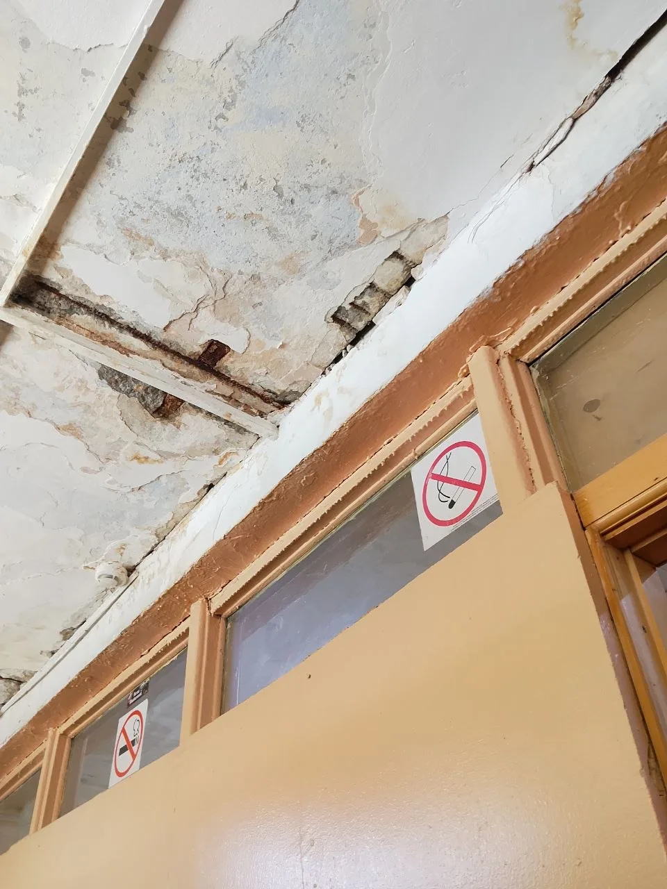 Сразу при входе учеников встречают облезлые стены и полуразрушенный потолок. Как может быть в таком состоянии городская школа?