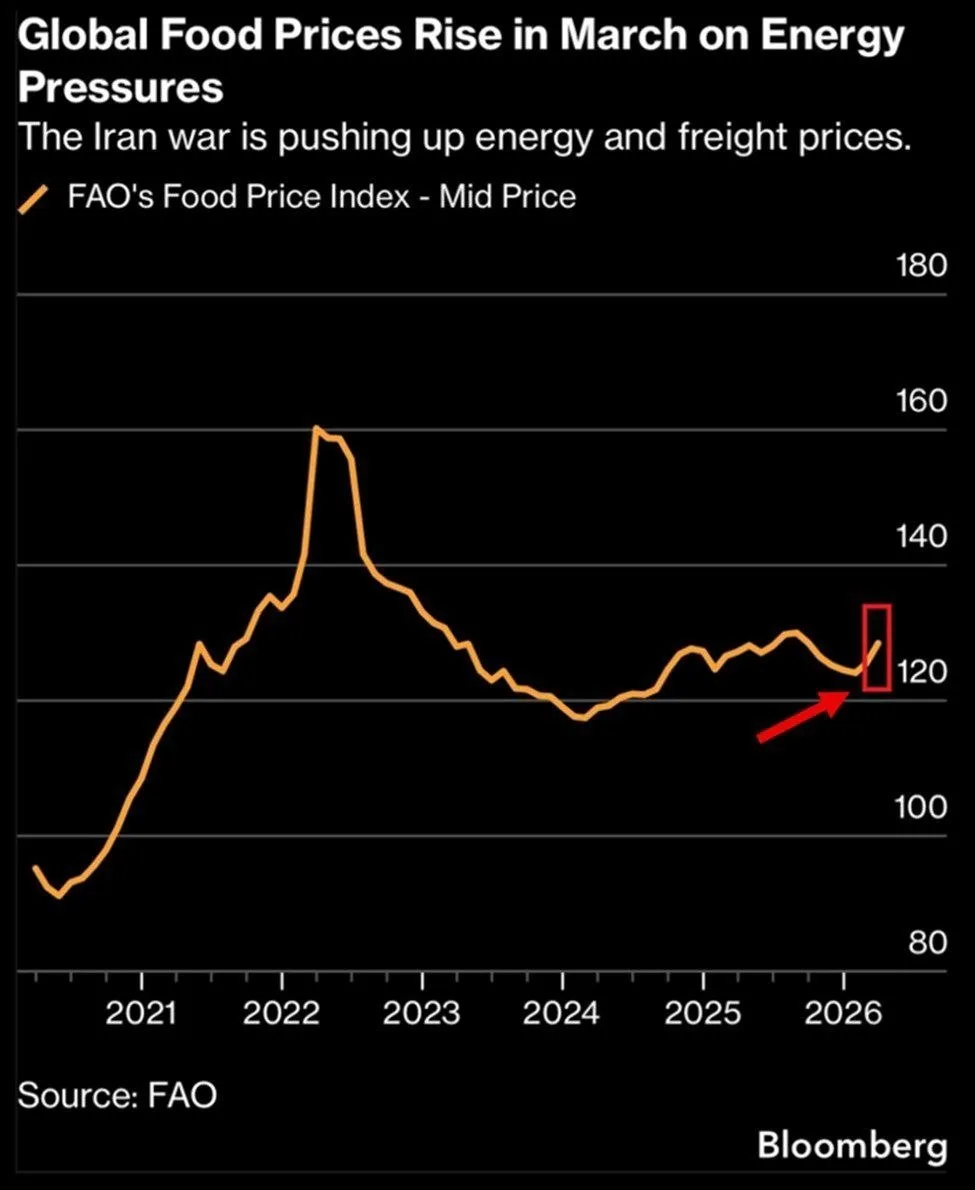В марте индекс мировых цен на продукты питания подскочил сразу на +2,4%, достигнув 128,5 пунктов. Это самый высокий уровень с сентября 2025 года. Индекс отслеживает мировые цены на зерно, сахар, мясо, молочные продукты и растительные масла.