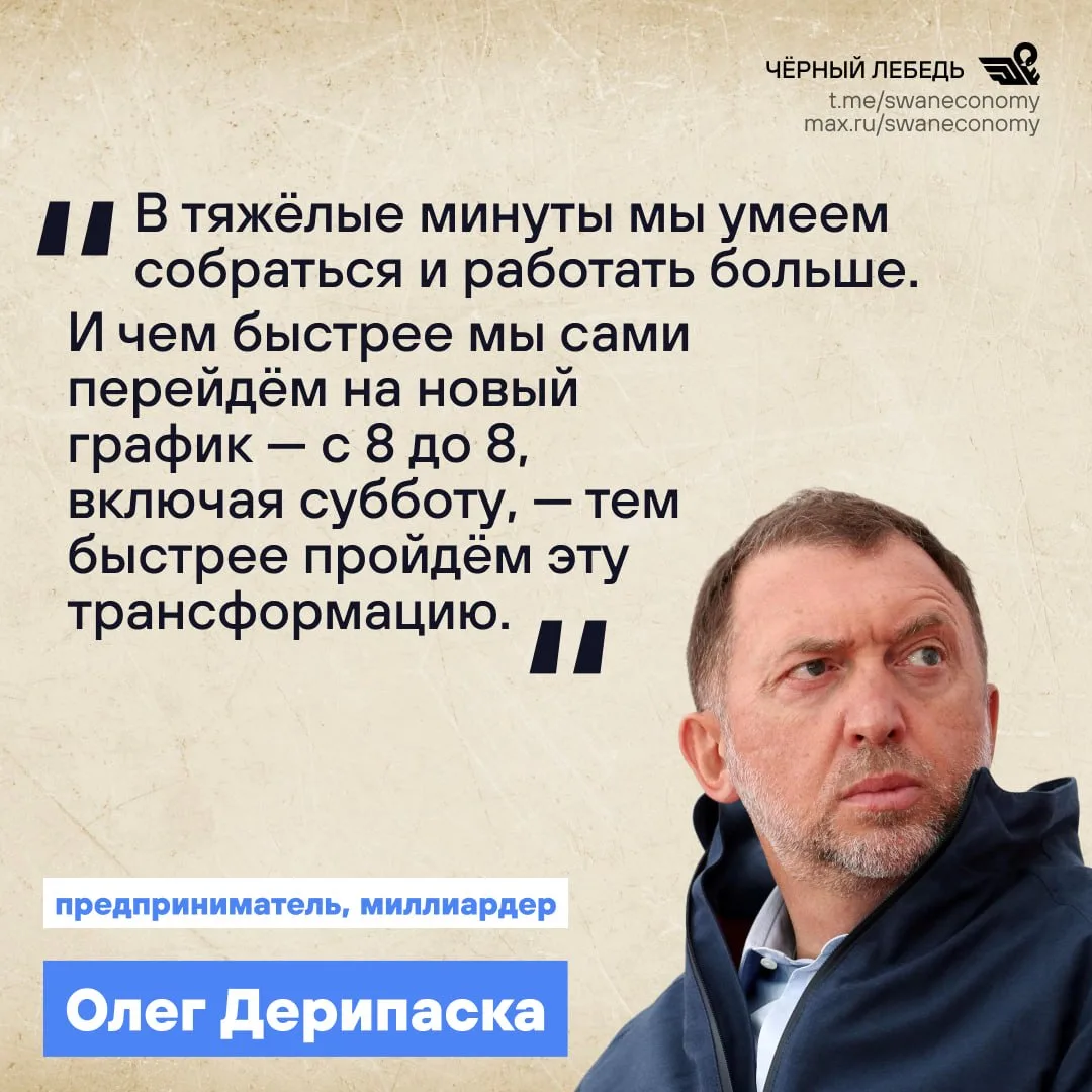 Олег Дерипаска сегодня вдруг разразился «гениальной» мыслью: раз мир находится в кризисе, то выход России из него заключается в том, чтобы увеличить себе рабочий график.