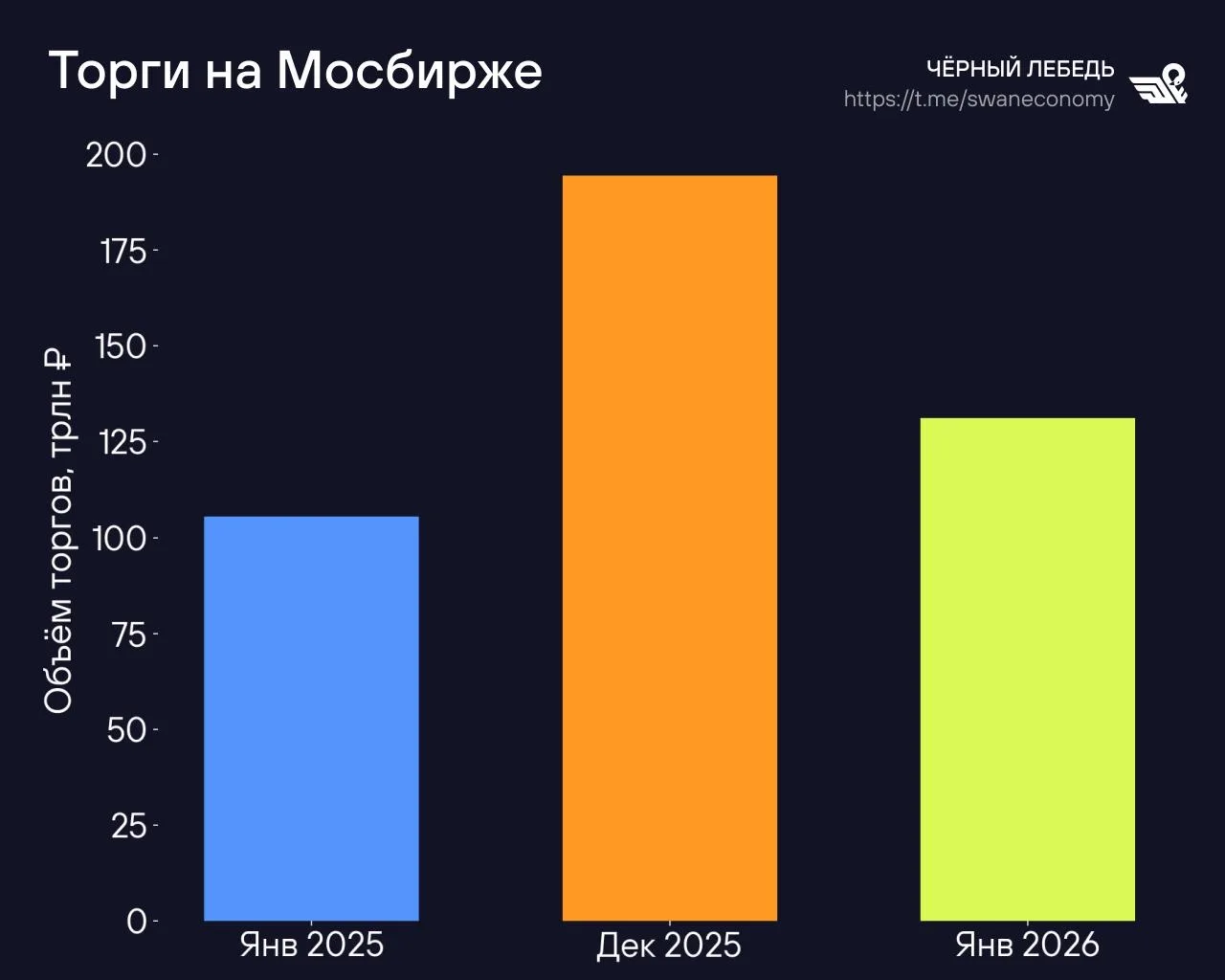 Январь 2026 на Мосбирже — 131,1 трлн рублей торгов. Год к году +24,4%. Казалось бы, рост во всём — но копнём глубже.