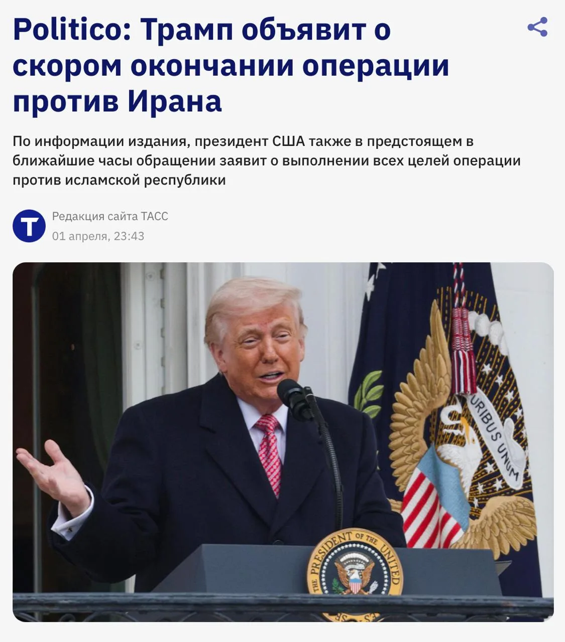 В новом видеообращении Трамп официально заявляет о победе над Ираном.