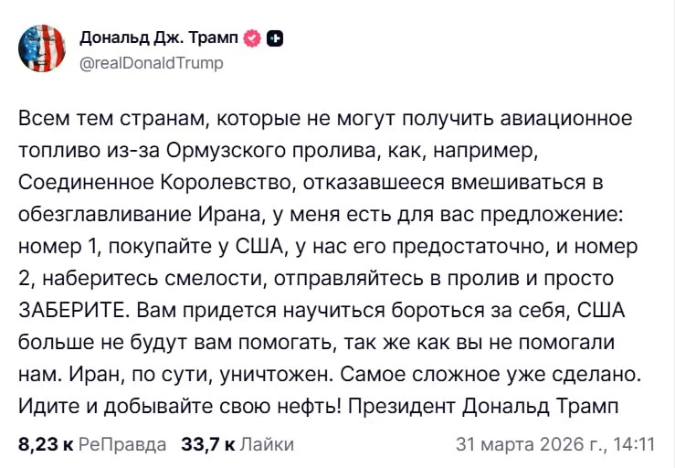 А Ормуз? Кому надо — сами сражайтесь с Тегераном и разблокируйте пролив. Либо покупайте нефть у США.