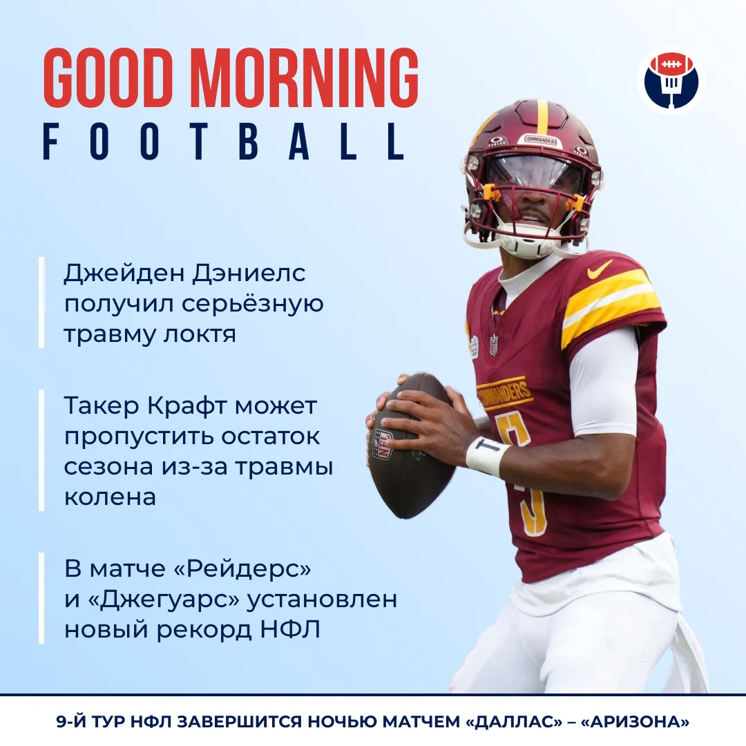 ☹️ Квотербек «Вашингтона» Джейден Дэниелс досрочно покинул поле в игре с «Миннесотой» после того, как повредил ранее травмированный локоть. По словам главного тренера Дэна Куинна, Дэниелса заменили на Маркуса Мариоту в целях предосторожности. Тяжёлую травму колена получил 35-летний тайт-энд «Коммандерс» Зак Эрц. Весьма вероятно, что для него это может быть конец карьеры.