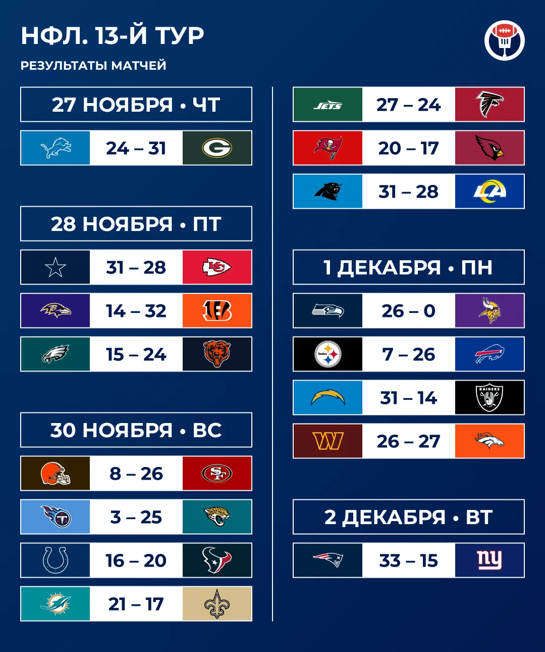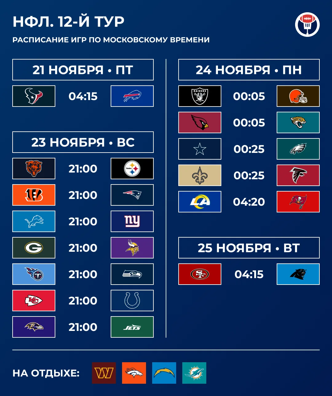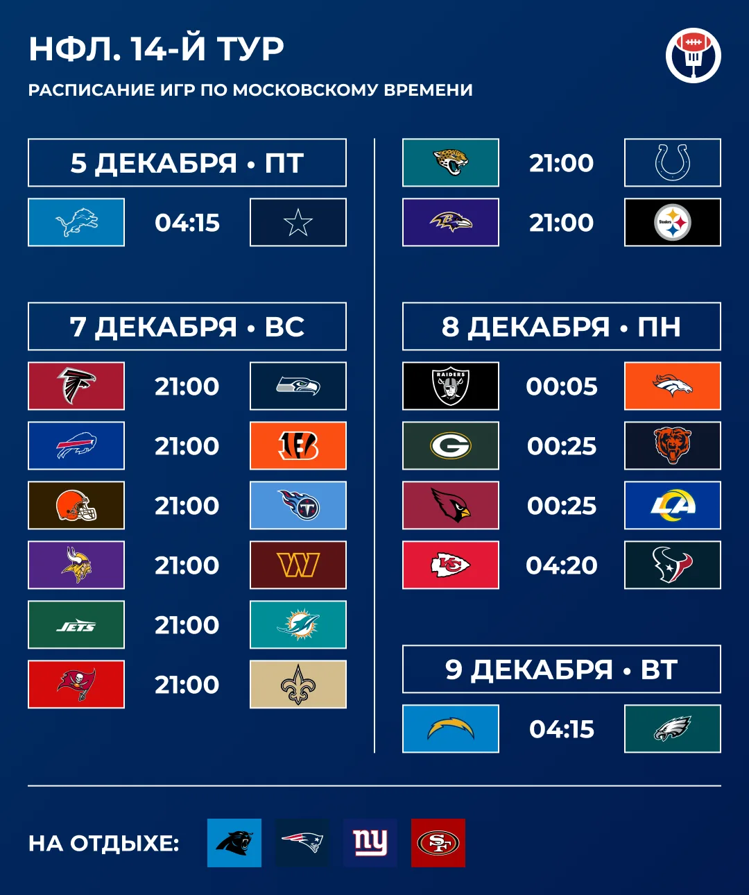 🗓 НФЛ заменила пару соперников на Sunday Night Football в 16-м туре. В прайм-тайм будет проведён матч «Балтимор» — «Нью-Ингленд», а изначально планировавшаяся туда игра «Майами» с «Цинциннати» переведена в первую волну.