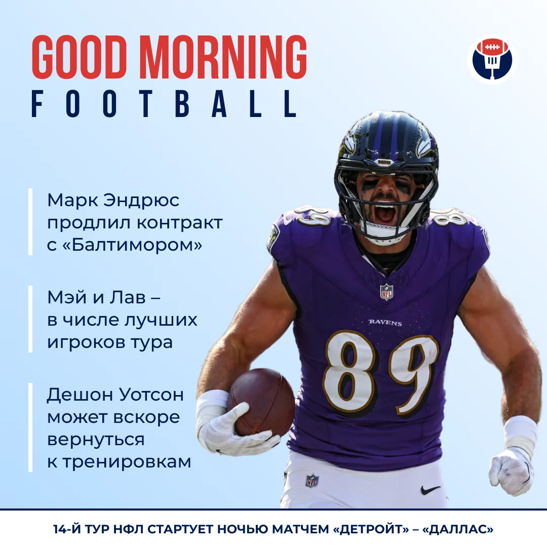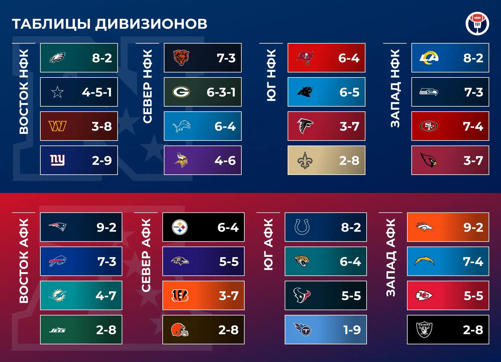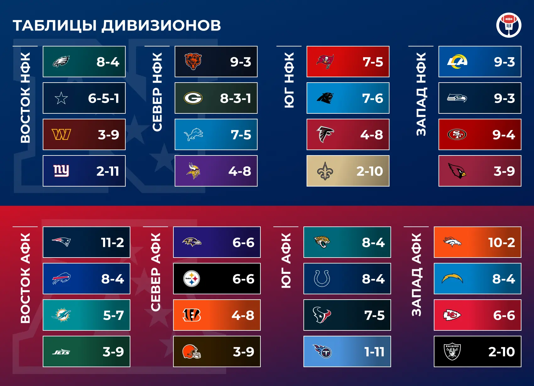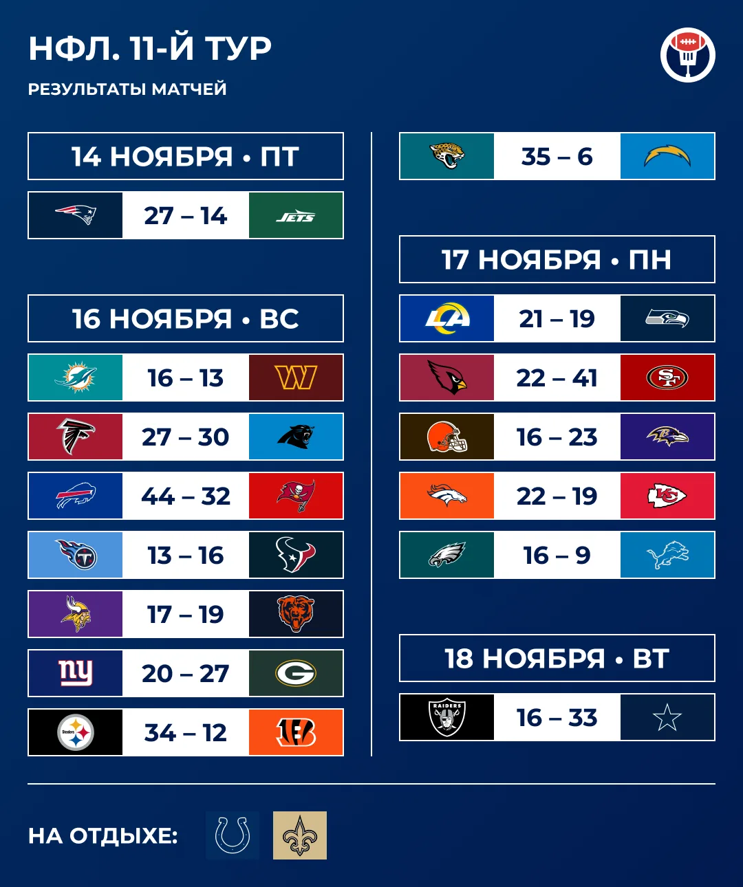 🗓 НФЛ заменила пару соперников на Sunday Night Football в 16-м туре. В прайм-тайм будет проведён матч «Балтимор» — «Нью-Ингленд», а изначально планировавшаяся туда игра «Майами» с «Цинциннати» переведена в первую волну.