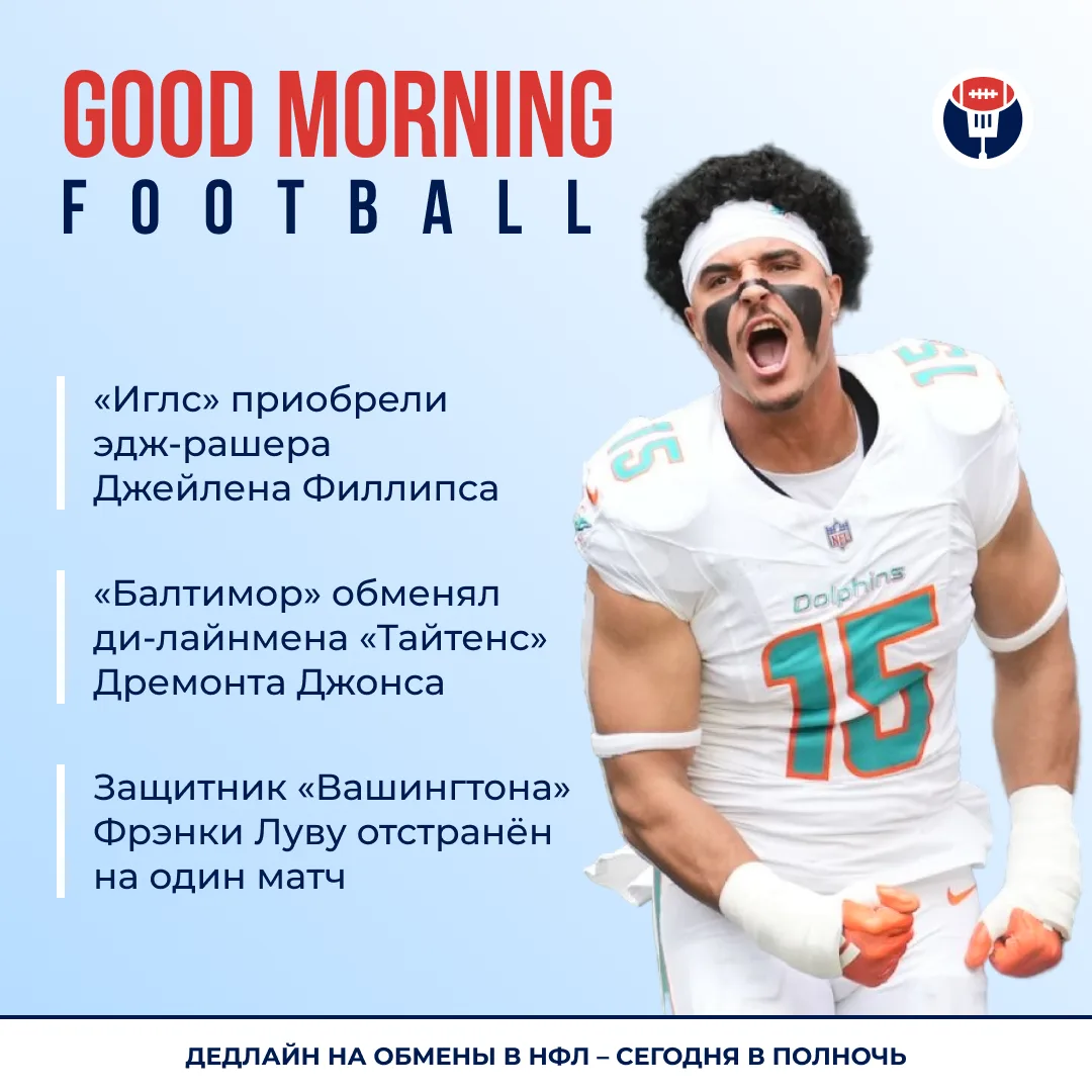 🐬 Дедлайн на обмены уже в этот вторник, поэтому в ближайшие дни нас ждёт масса интересных новостей. Готовится к серьёзной распродаже «Майами». Главные кандидаты на выход — эдж-рашеры Джейлен Филлипс и Брэдли Чабб. Пока неизвестно, оба сразу или только кто-то один. По поводу ресивера Джейлена Уоддла есть разная информация — одни источники пишут, что «Долфинс» ни за что не расстанутся с ведущим игроком, другие же говорят, что вопрос в цене.